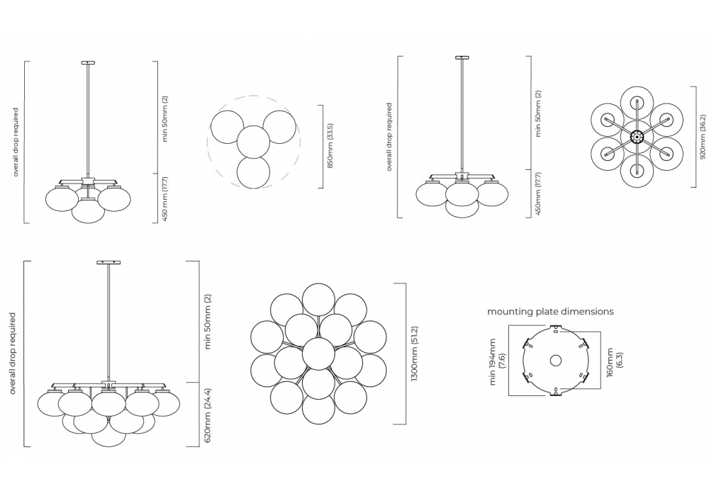 | Dimensions | Ø 85 x H 39 cm - 4 x E27; Ø 92 x H 39 cm - 7 x E27; Ø 130 x H 58 cm - 16 x E27. |