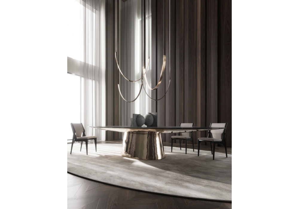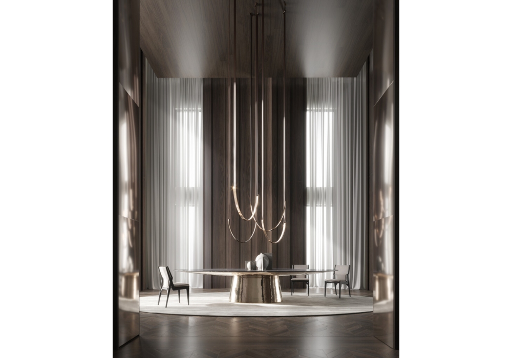 Mayline designed by Adele Martelli for Emmemobili is a suspension lamp with ring made of brass with brown leather bands. Lighting with LED strips that can be positioned upwards or downwards. The bands, which cover the 2 support cables and the electric cable, have a maximum standard length of 200 cm. Dimmable version available on request and with a surcharge.
