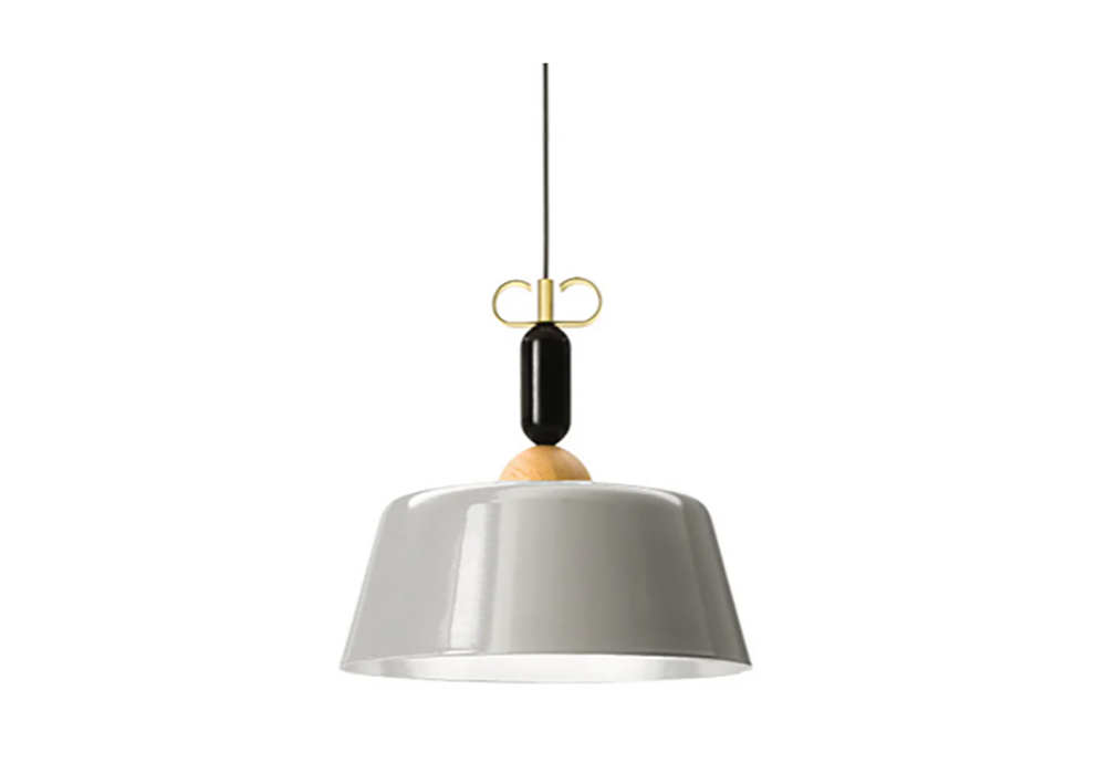Bon Ton N3 designed by Cristina Celestino for Il Fanale is a pendant lamp with supporting structure in natural brass and oak wood. The diffuser has a rounded shape with white internal parts and shields a dimmable LED light source. Bon Ton N3 is available in different finishes.
