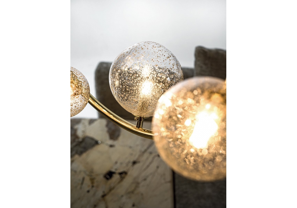 Rialto designed by Giuseppe Iasparra for Longhi is a pendant lamp with metal structure in light gold and black nickel galvanic finishes. Blown glass spheres of different dimensions with gold inserts for the light gold and brass structure for the black nickel finish version. Available in different models.