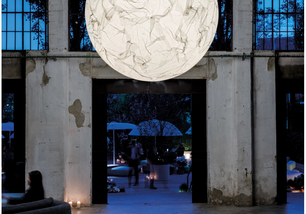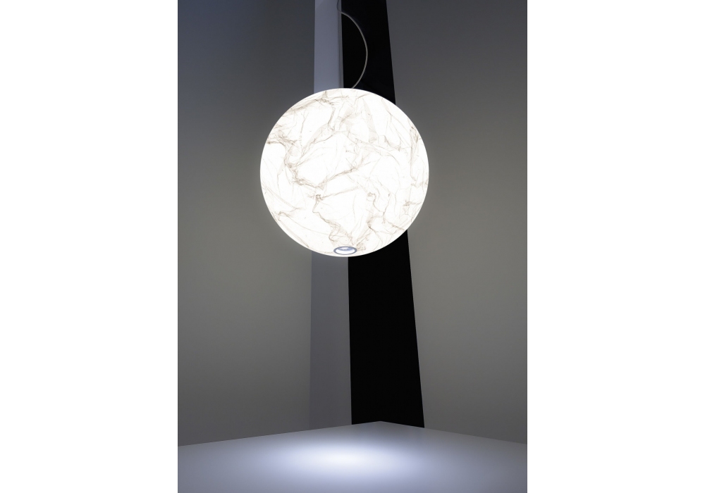 Moon 60 DE designed and produced by Davide Groppi is a spherical double emission pendant lamp with Japanese paper lampshade and stainless steel suspension cable. The light sources adopted are with E27 + GU10 type LED fitting.