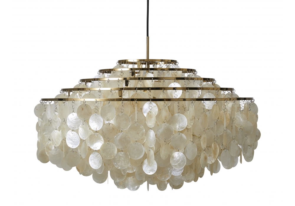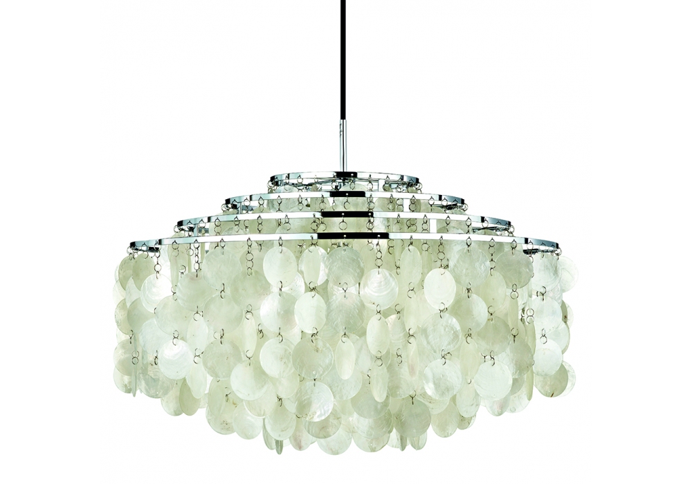 Fun designed by Verner Panton for Verpan is a suspension lamp featuring mother-of-pearl discs on a metal frame. The discs are connected to each other thanks to small metal rings. Rosette matching the metal discs. Available in different models.