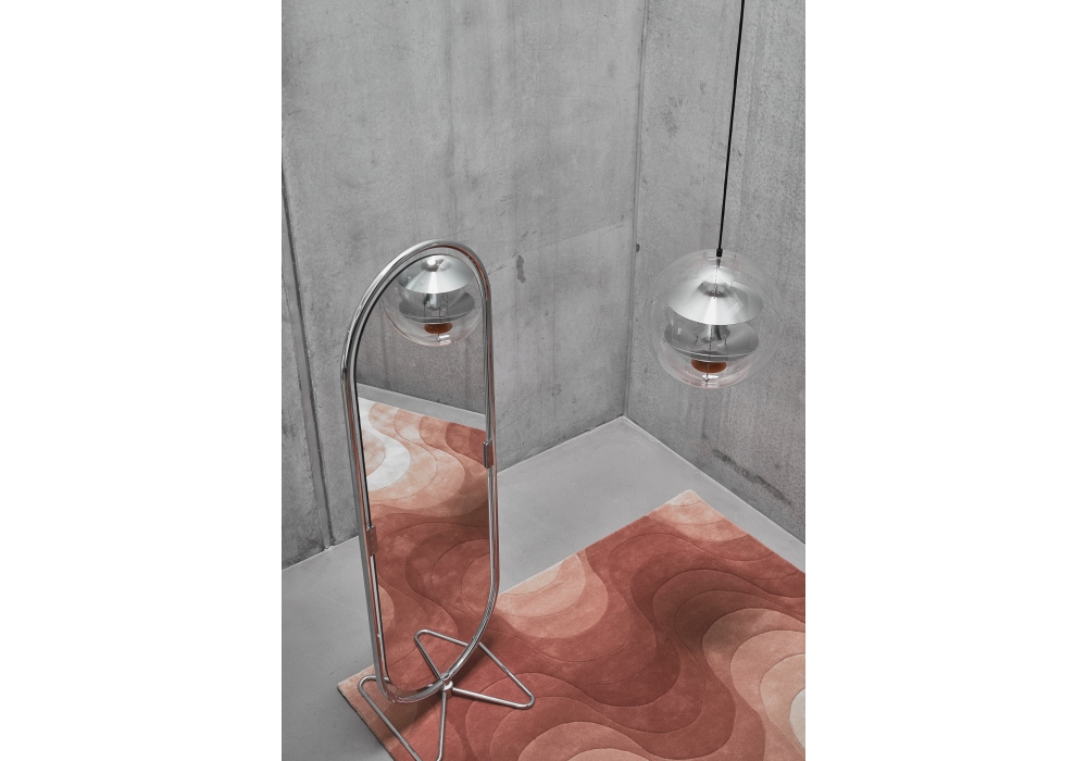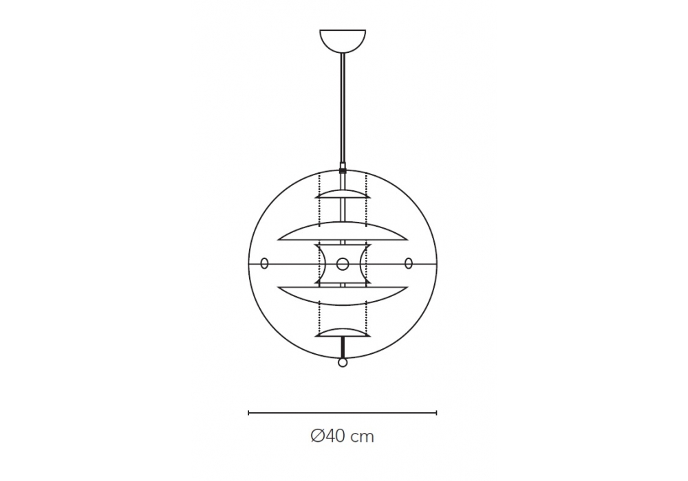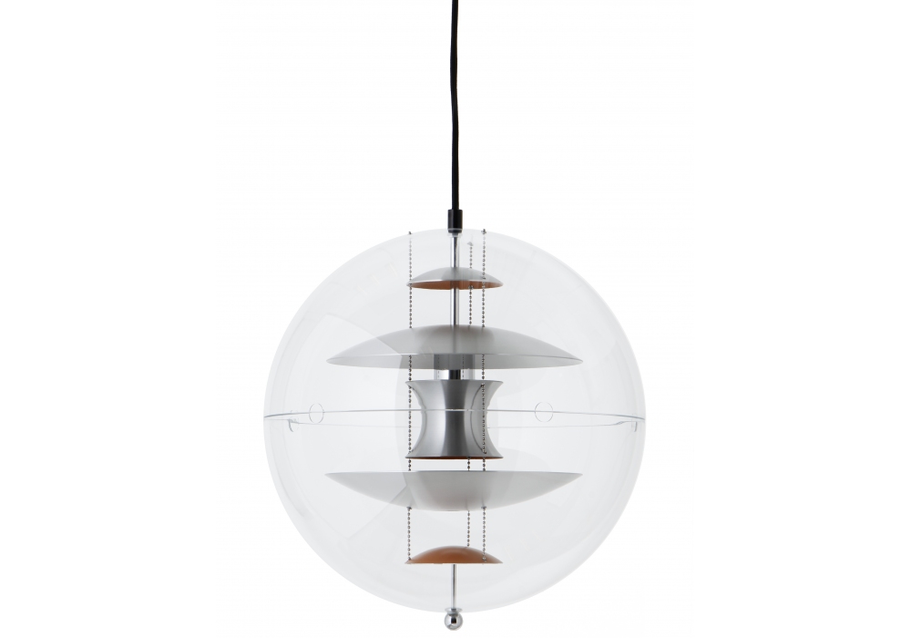 Vp Globe Brushed Alu designed by Verner Panton for Verpan is a suspension lamp with external sphere in crystalline transparent acrylic. Inside are reflectors in a brushed and burnt orange finish suspended from three steel chains. Rosette in chrome finish and suspension cable in black fabric.