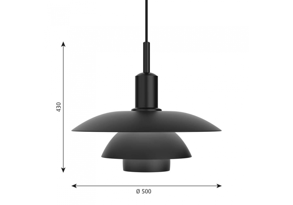PH 5/5 designed by Poul Henningsen for Louis Poulsen is a suspension lamp with structure made of black colored spun aluminium. The circular reflecting screens are structured in opal blown glass or aluminum and screen a dimmable LED or halogen light source with E27 fitting and in different light shades.