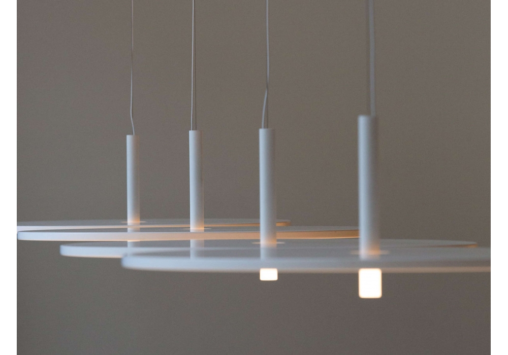 My Disc designed by Michael Anastassiades for Flos is a diffused light suspension lamp composed of a horizontal disc crossed by a vertical stem. Body in matt white painted aluminum with polycarbonate stem. Diffuser in silkscreened PMMA. LED light source included. The electronics integrated into the roof allow the use of dimming systems: PUSH dimming, 1-10V, DALI.