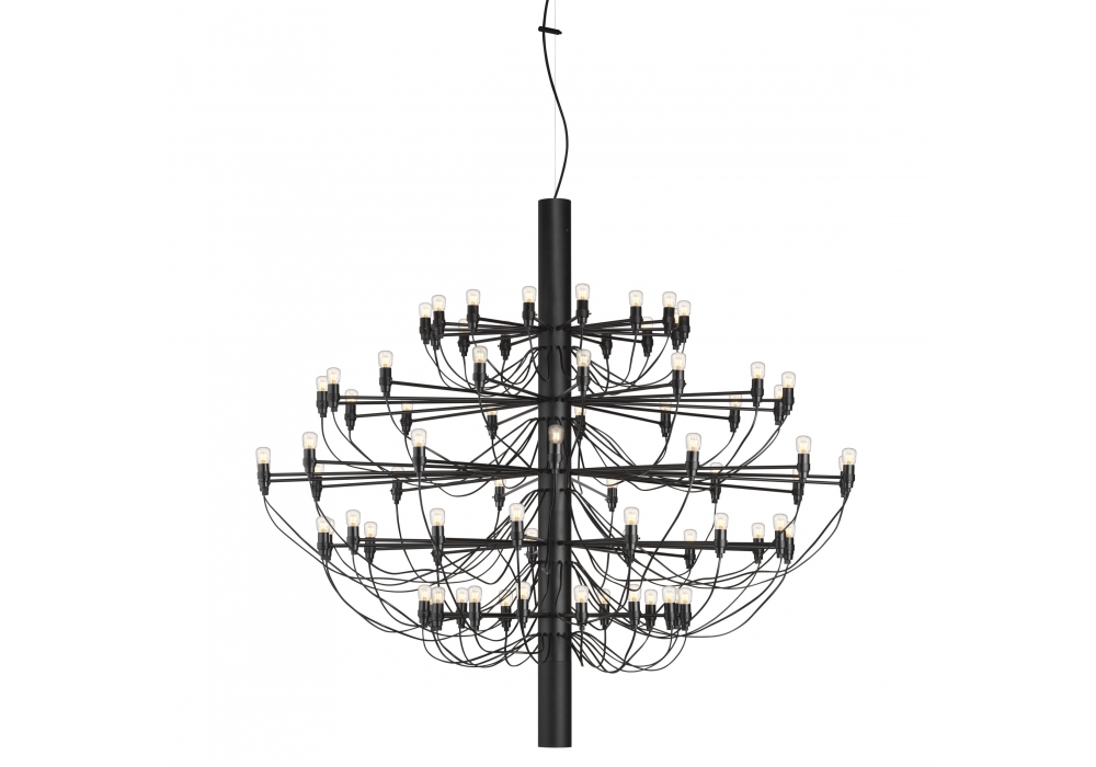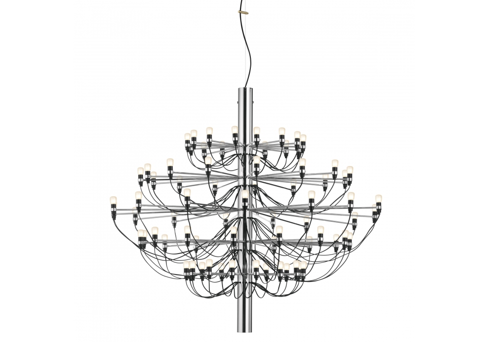 2097/75 designed by Gino Sarfatti for Flos is a pendant lamp with diffused light. Central structure in iron and arms in brass. Ceiling attachment and rose in steel. Remote control (dimmer not included). Bulbs included.