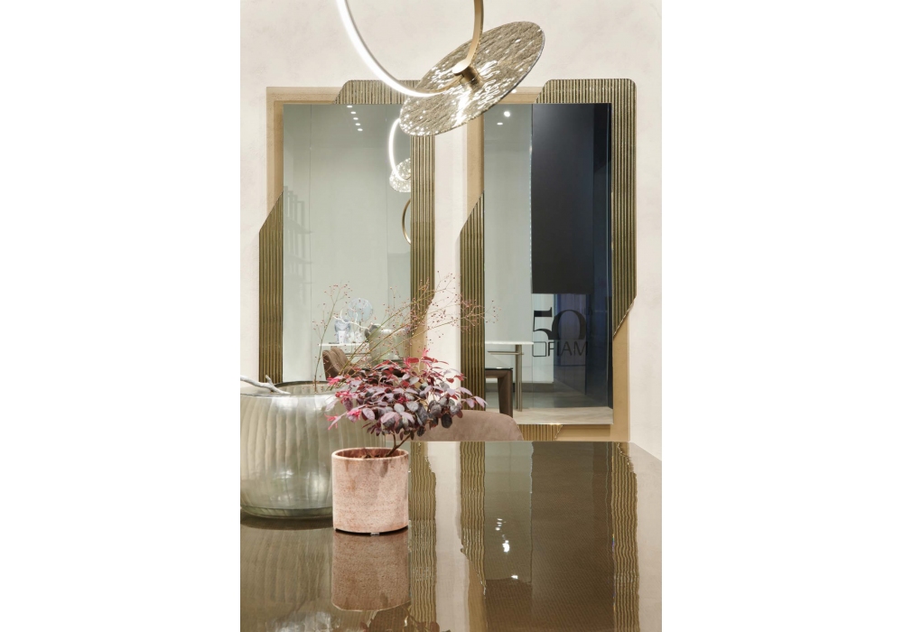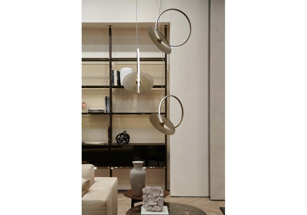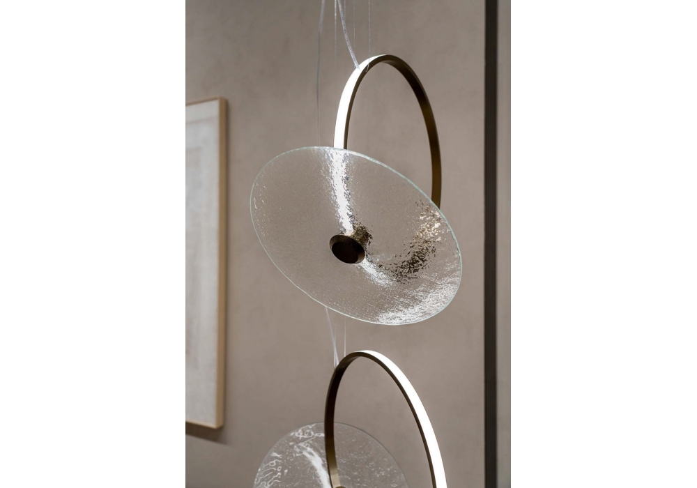 Marry Me designed by Davide Oppizzi for Fiam is a suspension lamp for interiors with Mid-Bronze finish aluminum ring structure and opal white plastic diffuser. LED light source integrated in the structure. Decorative diffuser in extralight, smoked or bronze fused glass, available in 2 texture variants: "organic" or "geometric"