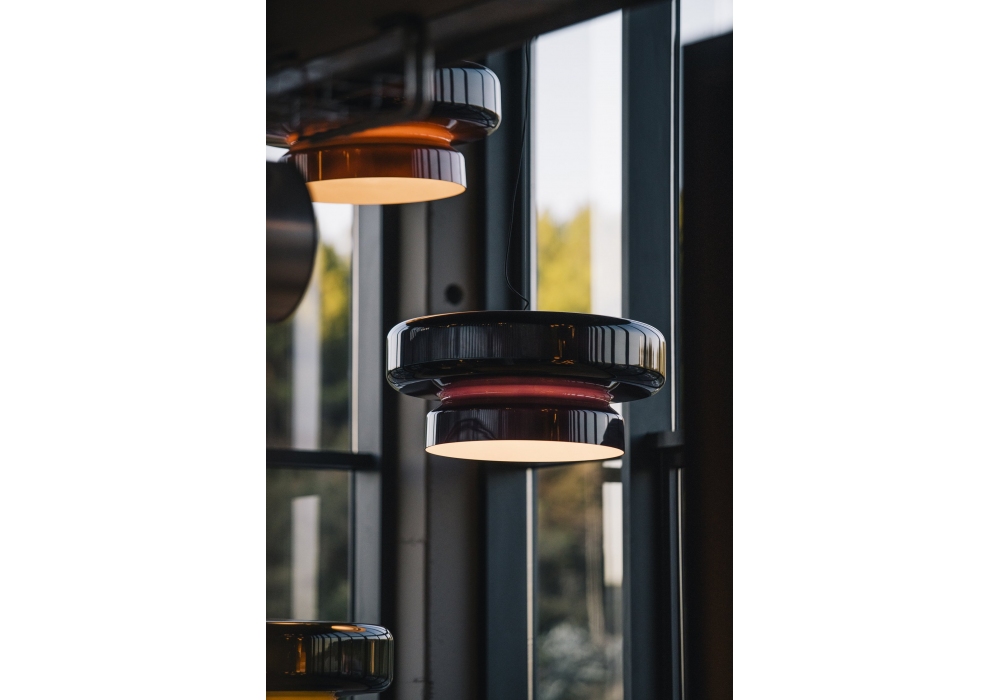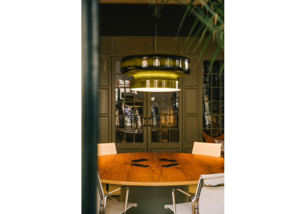Bohemia 84 designed by Joan Gaspar for Marset is a suspension lamp with polycarbonate lampshade and opal methacrylate diffuser. Available in different finishes.
