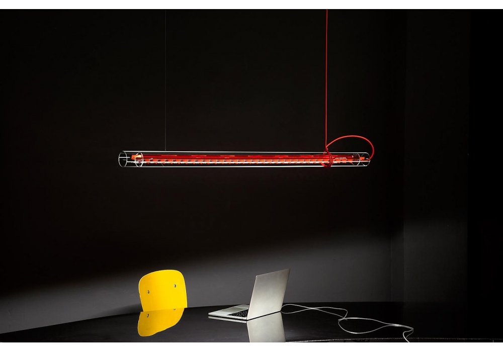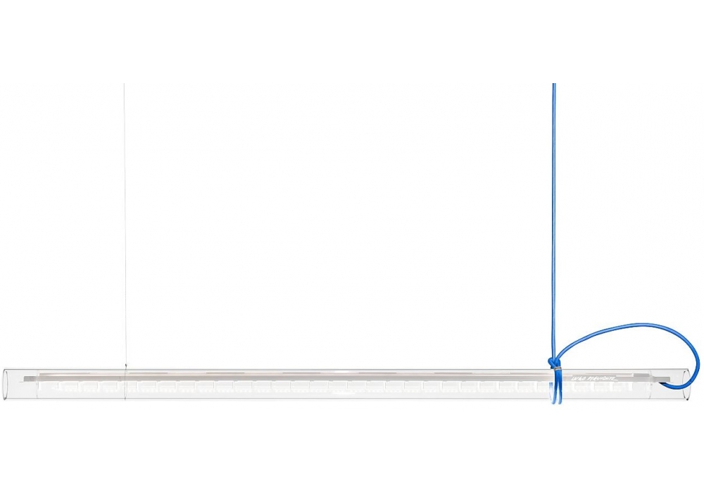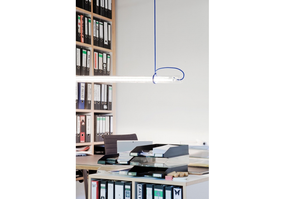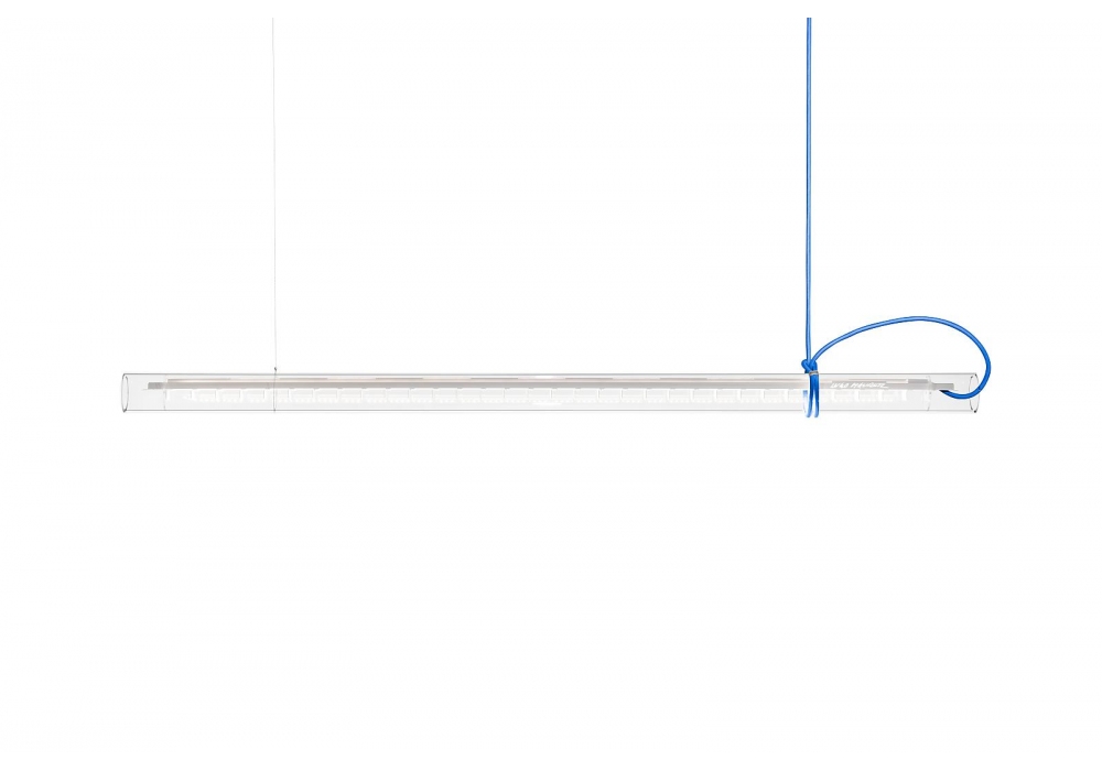 Tubular designed by Sebastian Hepting for Ingo Maurer is a multifunctional glass suspension lamp. The glass tube can be rotated 360° and can be used as a downlight, uplight or wallwasher.