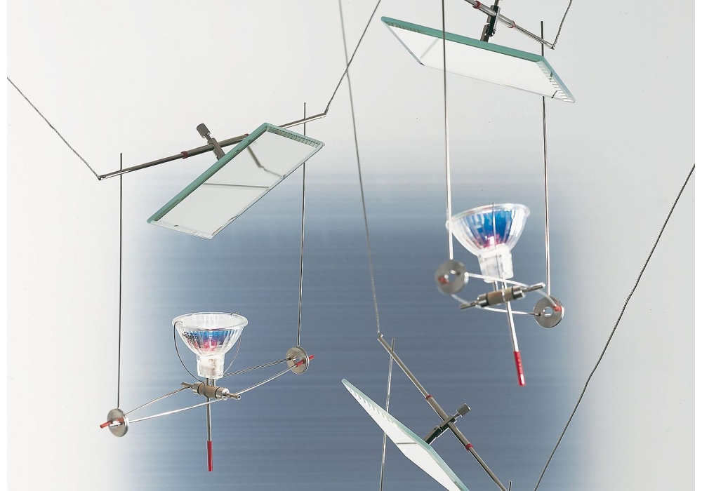 Yayaho Element 2 designed and produced by Ingo Maurer is a suspension lamp with structure in metal and synthetic material. Mobile along the cables horizontally and vertically. The mirror is an optional accessory. It can be combined with other Yayaho elements to create a larger lighting system.