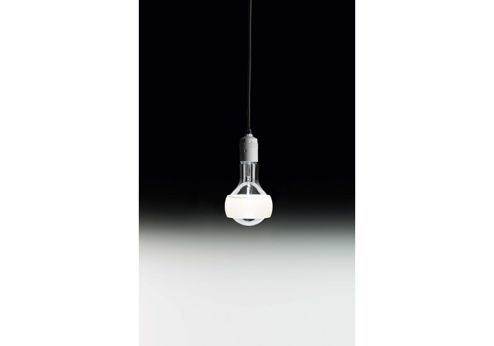 Johnny B. Bald designed and produced by Ingo Maurer is a suspension lamp with a special shape bulb Ø 10 cm and diffuser in white heat-resistant PTFE. Gray fabric cable. Metal socket, white lacquered.