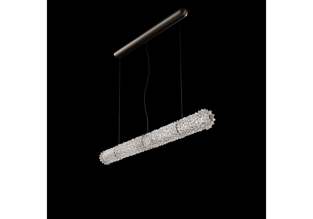 Opéra designed by Philippe Nigro for Barovier & Toso is a pendant lamp with supporting structure in brushed black nickel or brushed gold colored metal. The diffuser is a horizontal element with a cylindrical shape, with a reflecting core and body in crystal and screens a dimmable LED light source. Opéra is available in different models and metal finishes.