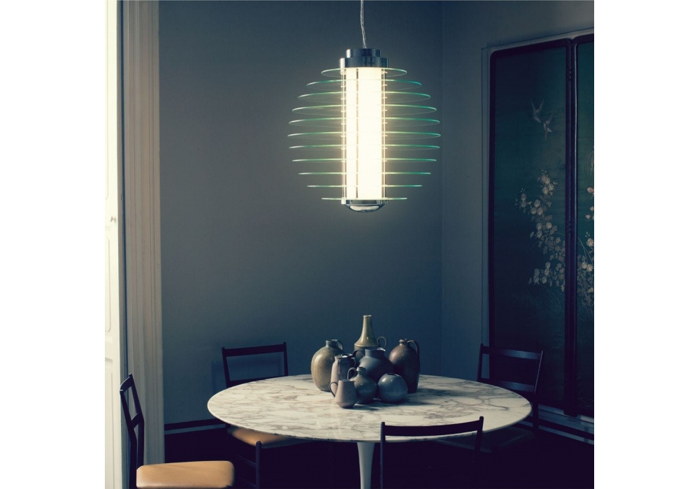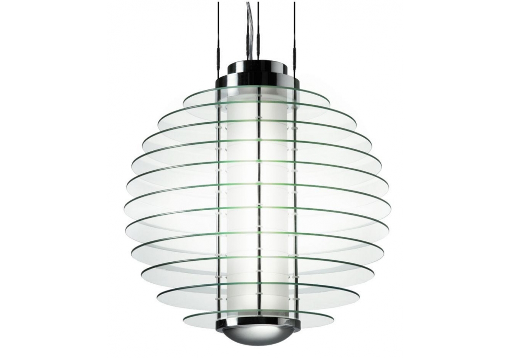 0024 designed by Gio Ponti for Fontana Arte is a pendant lamp, with chromed brass structure, supported by a steel suspension cable. The diffuser is structured by transparent tempered glass discs, with a cylindrical body in the center, again in glass but heat-resistant and sandblasted.