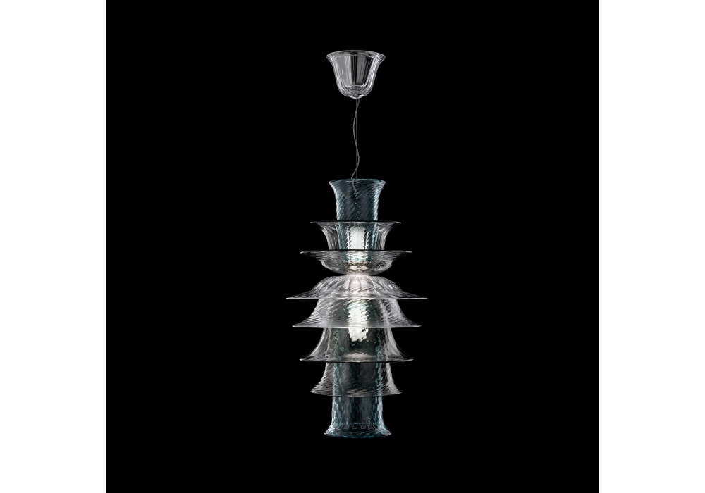 Campanula designed by García Cumini for Barovier & Toso is a pendant lamp with supporting structure and details in polished chrome colored metal. The lamp body and the diffuser is structured by a series of circular glass elements placed side by side. The light source adopted is of the dimmable LED type. Campanula is available in different models and finishes.