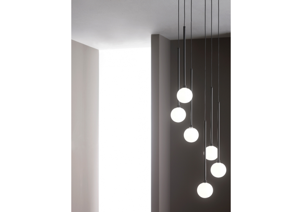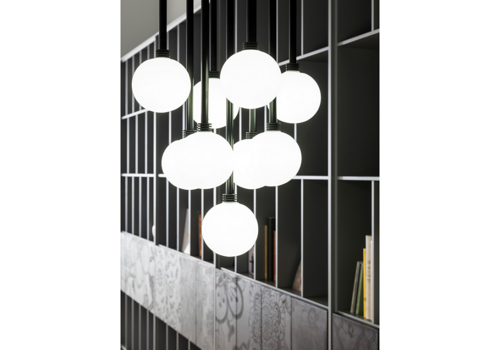 Brillo designed by Alessio Bassan for Capodopera is a pendant lamp providing diffused light with diffuser in transparent or opal Pyrex glass. The structure is in matt black powder-coated metal.