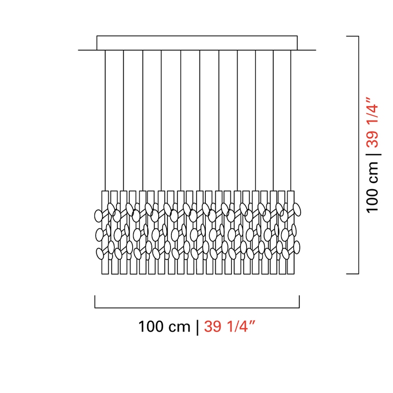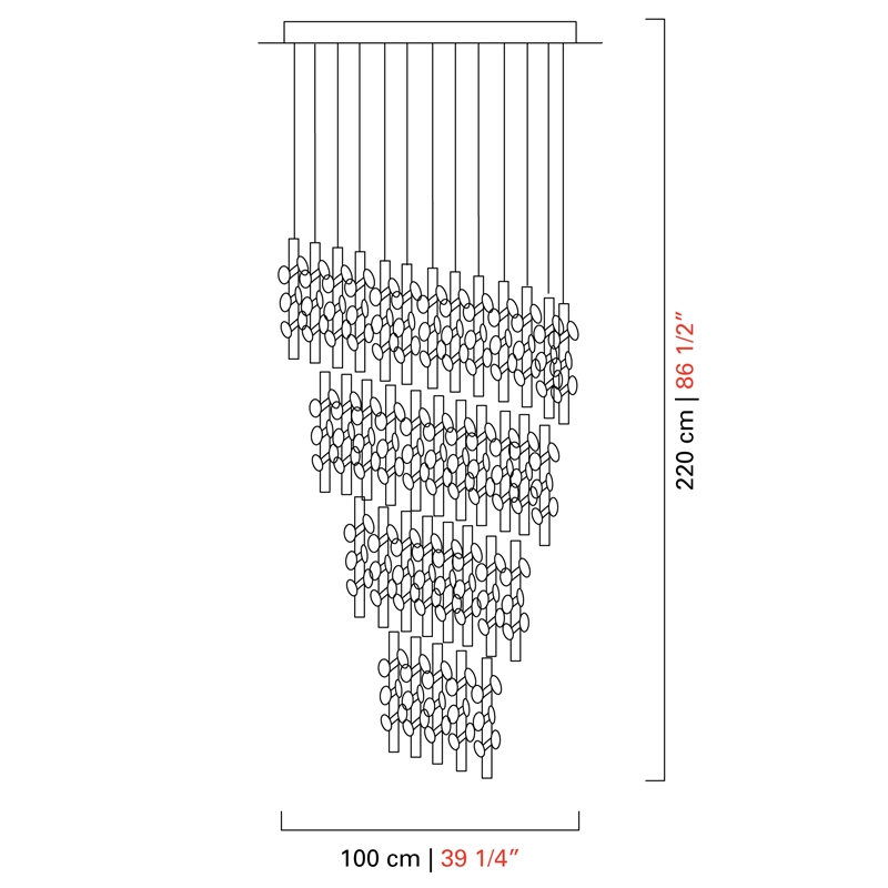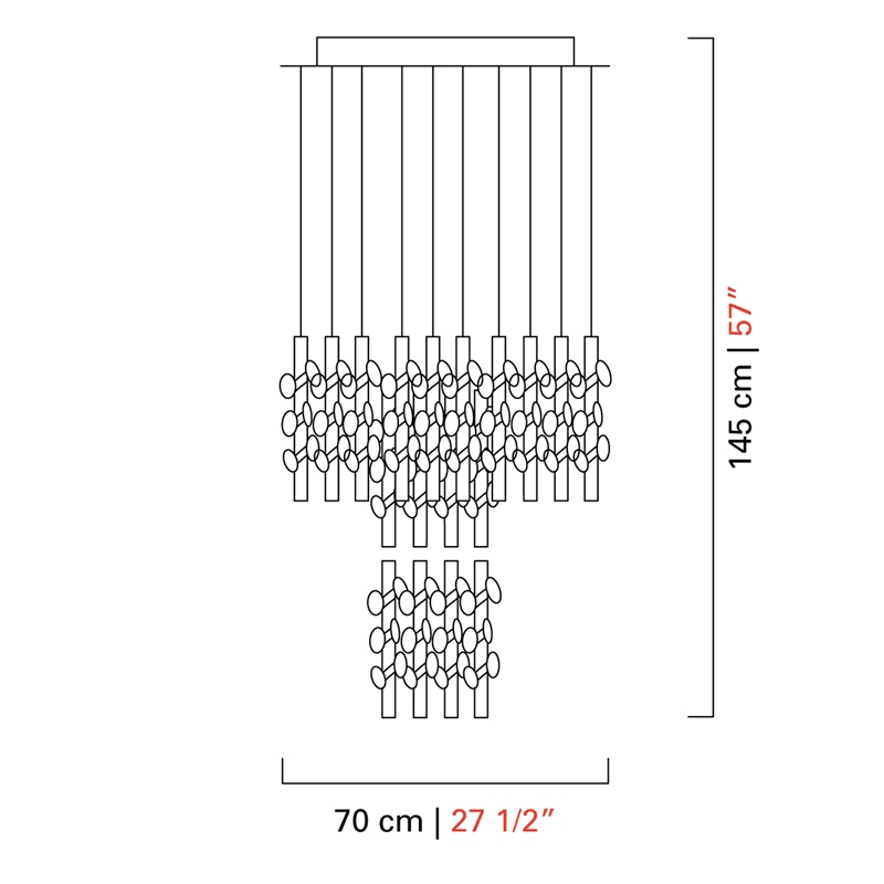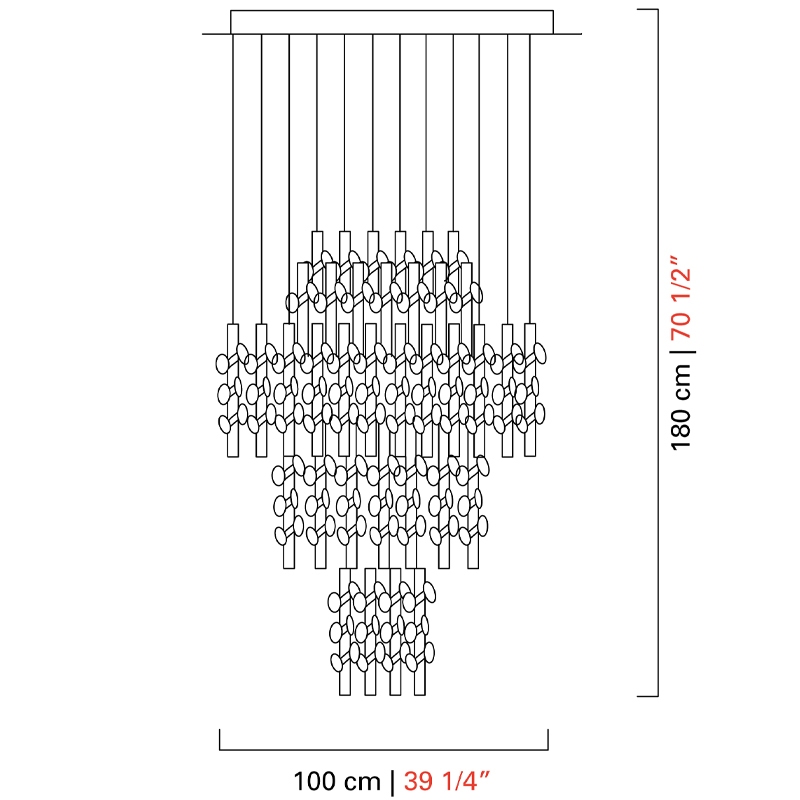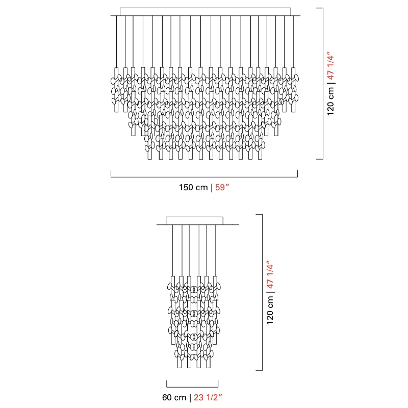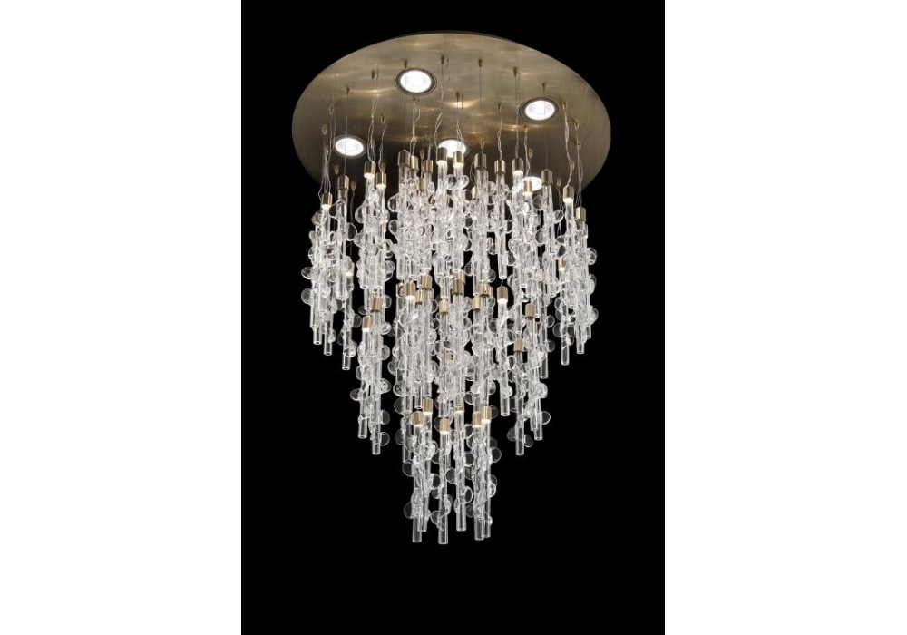 Germogli designed and produced by Barovier & Toso is a suspension lamp with a circular supporting structure in polished chrome or brushed gold colored metal. The pendants are in Venetian glass and metal. The light sources placed in the supporting structure are of the dimmable LED type. Germogli is available in different models and finishes.