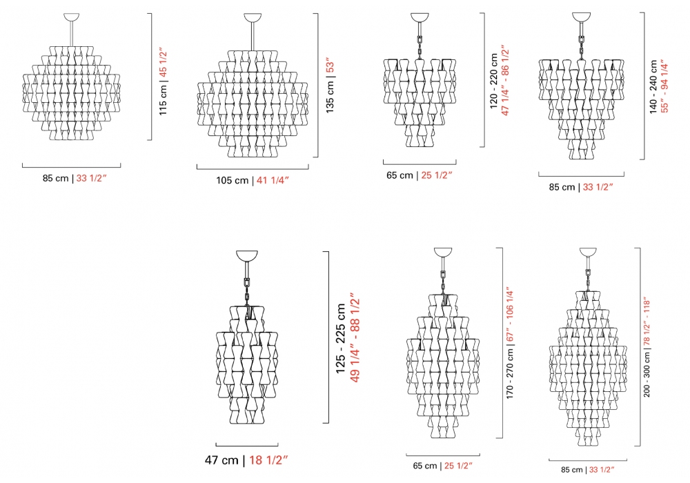 | Dimensions | Ø 85 x H 115 cm; Ø 105 x H 135 cm; Ø 65 x H 120-200 cm; Ø 120 x H 140-220 cm; Ø 47 x H 125-225 cm; Ø 65 x H 170-270 cm; Ø 85 x H 200-300 cm. |