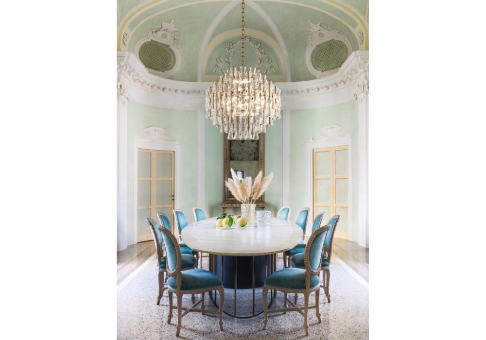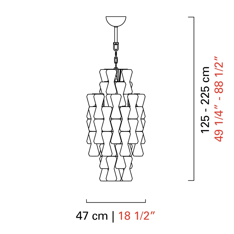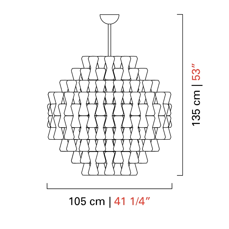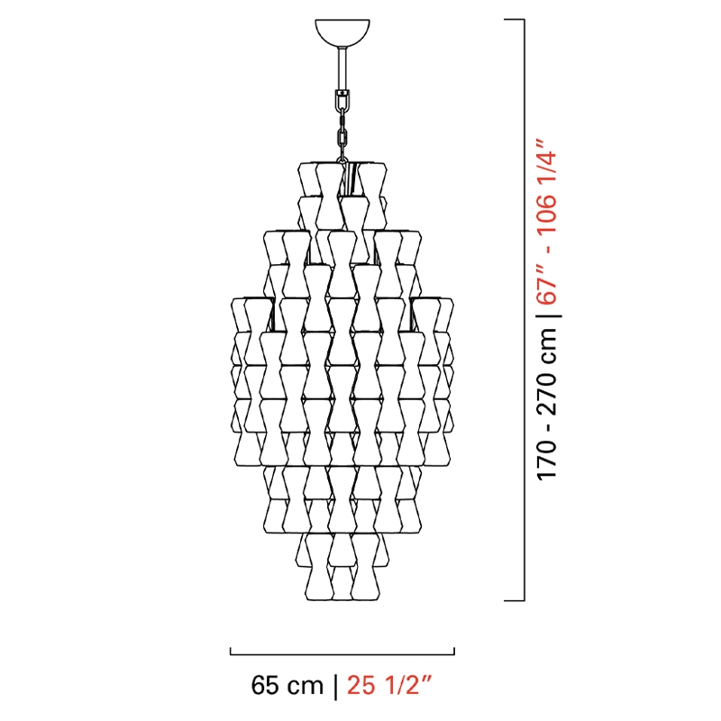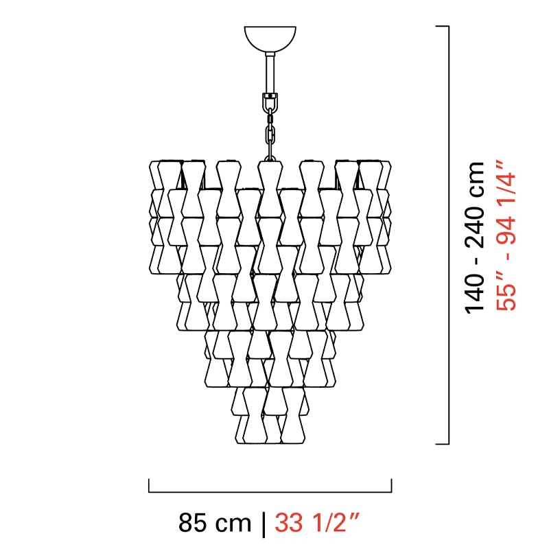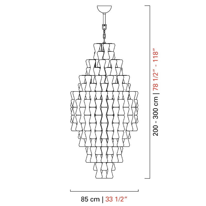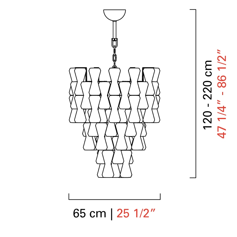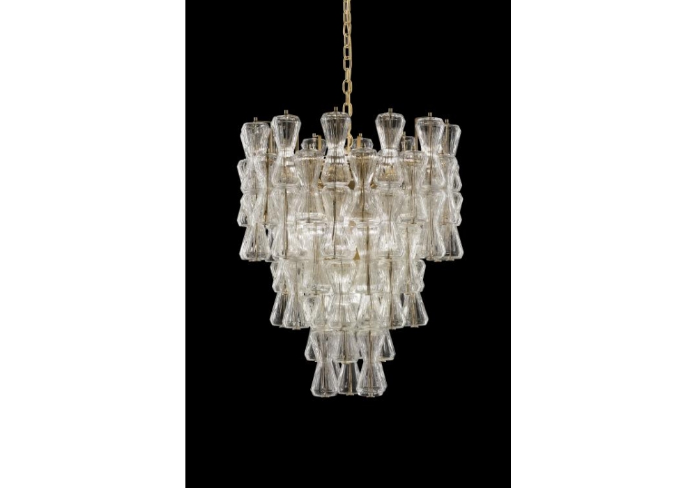 Clepsydra designed and produced by Barovier & Toso is a multi-level pendant lamp with supporting structure and details in polished chrome or galvanized gold colored metal. The diffuser is made up of various hourglass-shaped elements in Venetian glass and fencing of dimmable LED or halogen light sources. Clepsydra is available in different models and finishes.