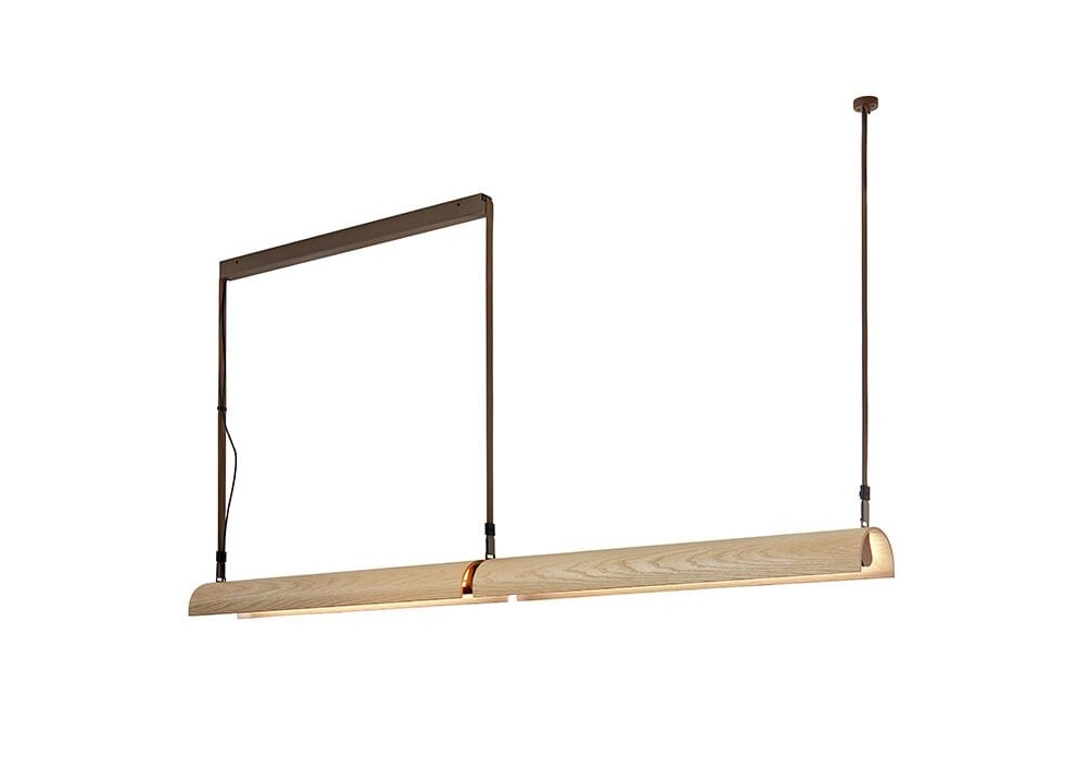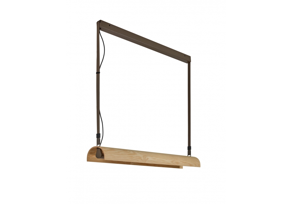 Aluet designed by Emiliana design studio for Bover is a pendant lamp with quadrangular ceiling rose in painted metal and support straps in fabric. The semicircular lampshade is in beige ash and screens dimmable LED light sources. Aulet is available in different models and versions.