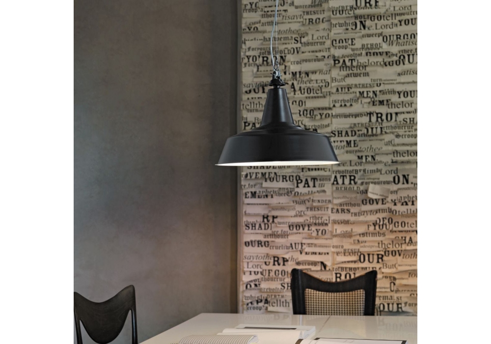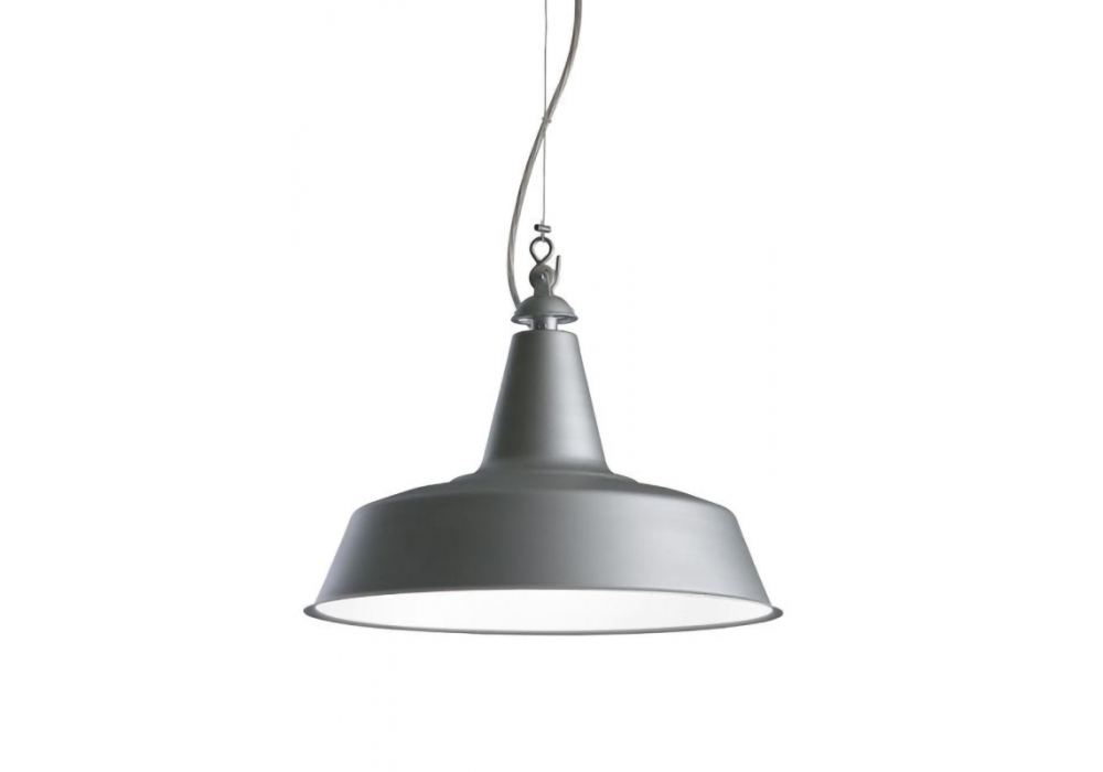 Huna produced and designed by Fontana Arte is a dimmable direct light suspension lamp. Diffuser and hook in painted metal. Steel suspension cable. Transparent power cable. Rosette in painted thermoplastic material. Available in different finishes.