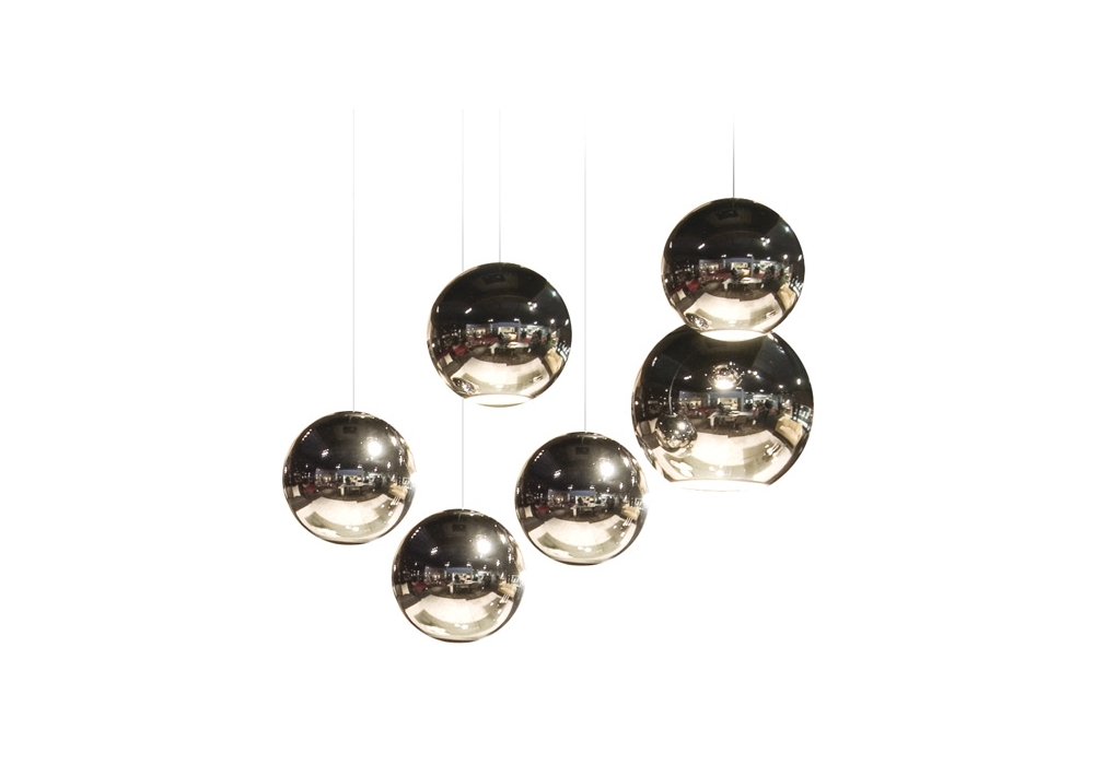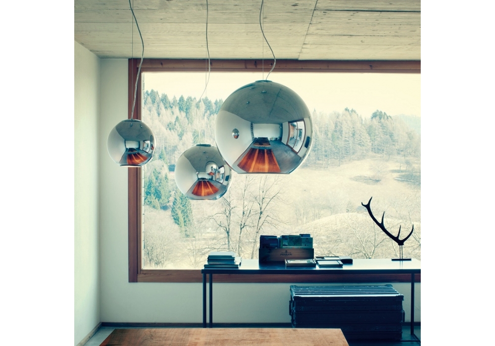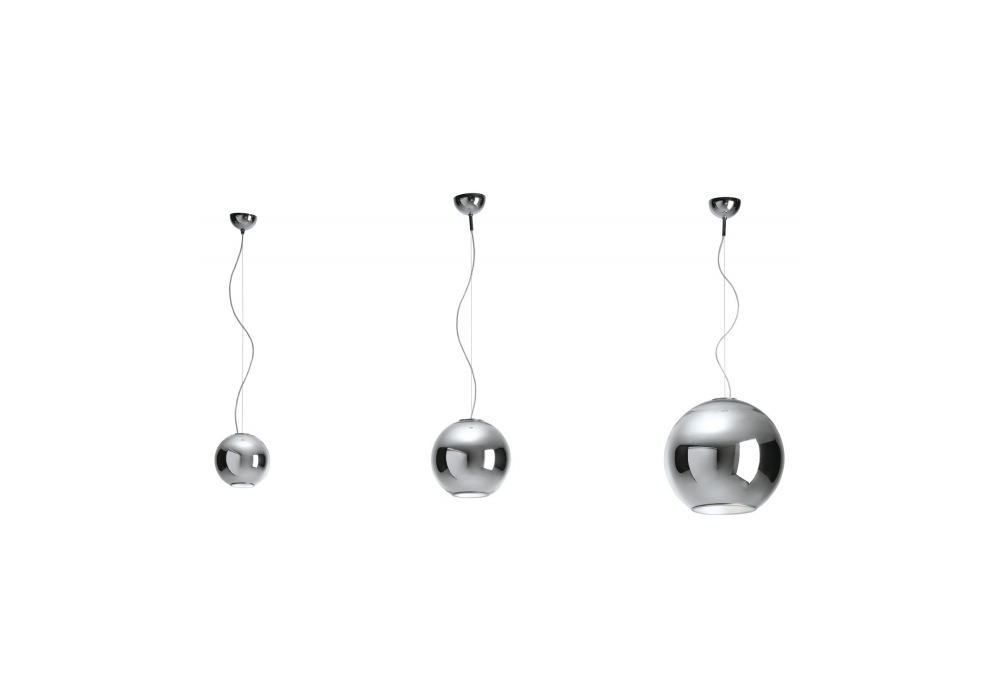Globo Di Luce designed by Roberto Menghi for Fontana Arte is a pendant lamp, with suspension cable in steel and spherical lamp body in metallized blown glass in copper or chrome finishes. The internal diffuser is in polished aluminum.