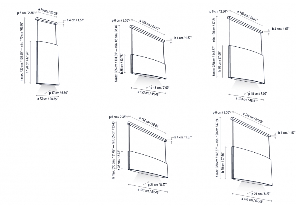 | Dimensions | 72 x 6 x H 120 cm Hmax 420 cm; 123 x 6 x H 35 cm Hmax 335 cm; 123 x 6 x H 70 cm Hmax 370 cm; 151 x 6 x H 35 cm Hmax 335 cm; 151 x 6 x H 70 cm Hmax 370 cm. |
