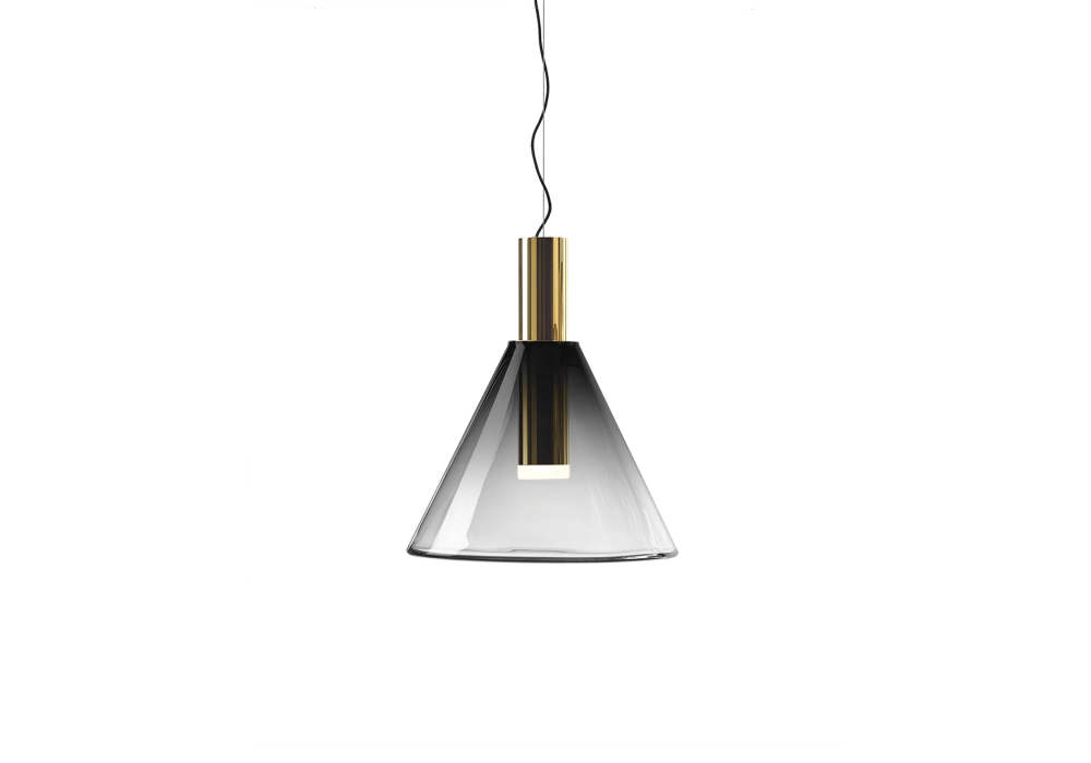 Phenomena Cone designed by Dechem Studio for Bomma is a pendant lamp with mouth-blown crystal lampshade and metal diffuser. It is available in different finishes.