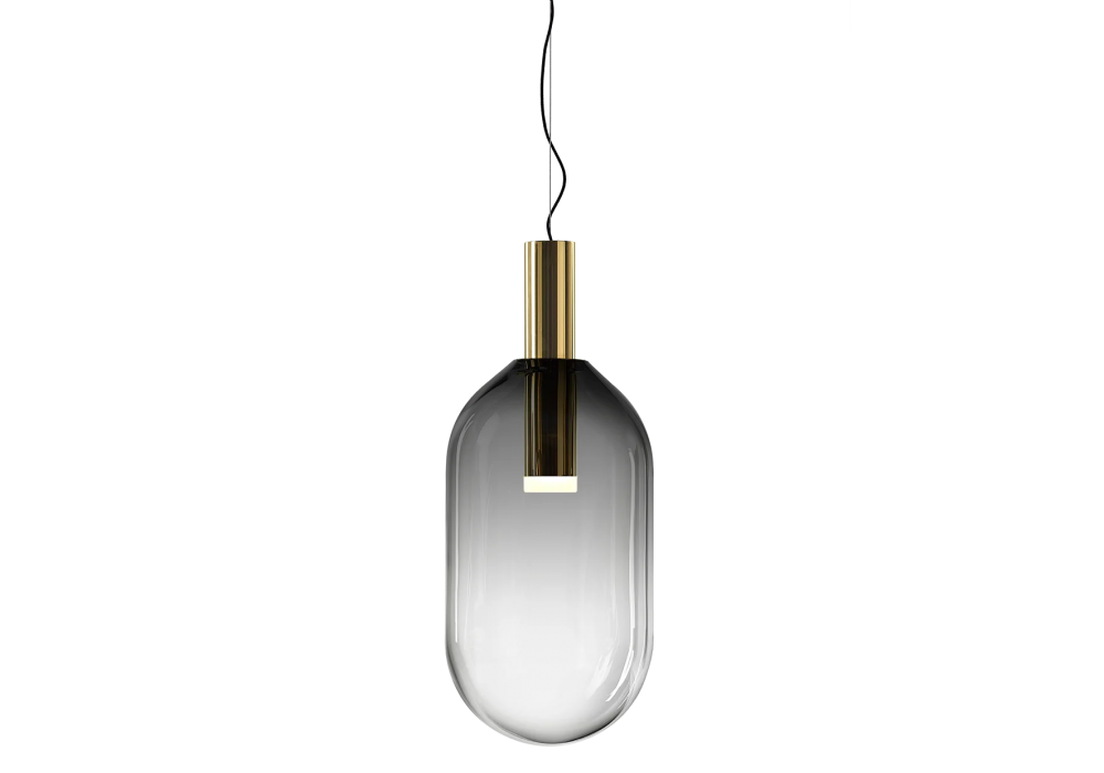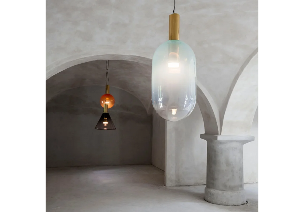Phenomena Capsule designed by Dechem Studio for Bomma is a pendant lamp with mouth-blown crystal lampshade and metal diffuser. It is available in different finishes.