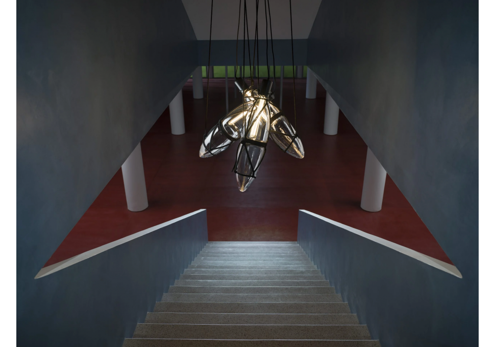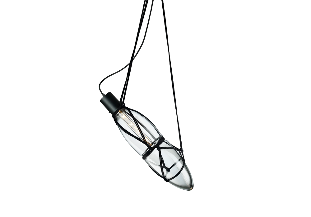 Shibari designed by Kateřina Handlová for Bomma is a pendant lamp with mouth-blown crystal diffuser and black textile cable. Available in different models.