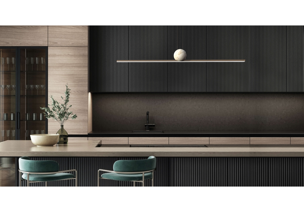 Regolo designed by Stefano Traverso for Italamp is a pendant lamp with metal diffuser profile in matt black or matt champagne finish. Decorative sphere in gold Calacatta or Marquina marble. Opal methacrylate diffuser