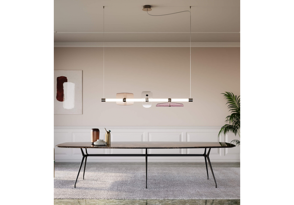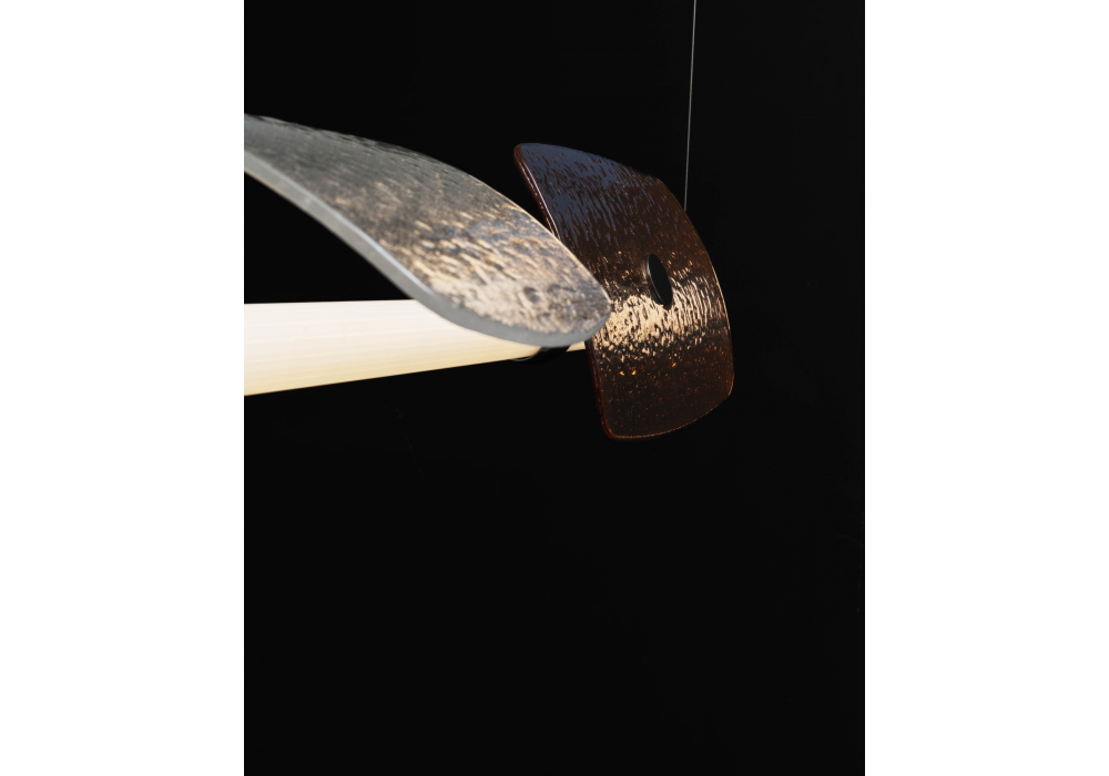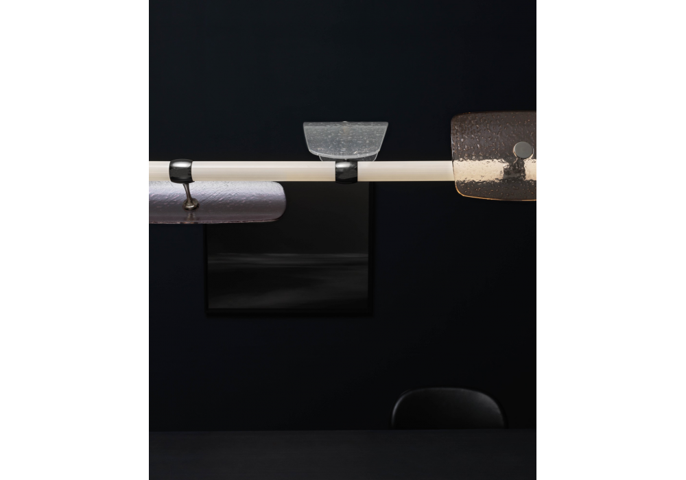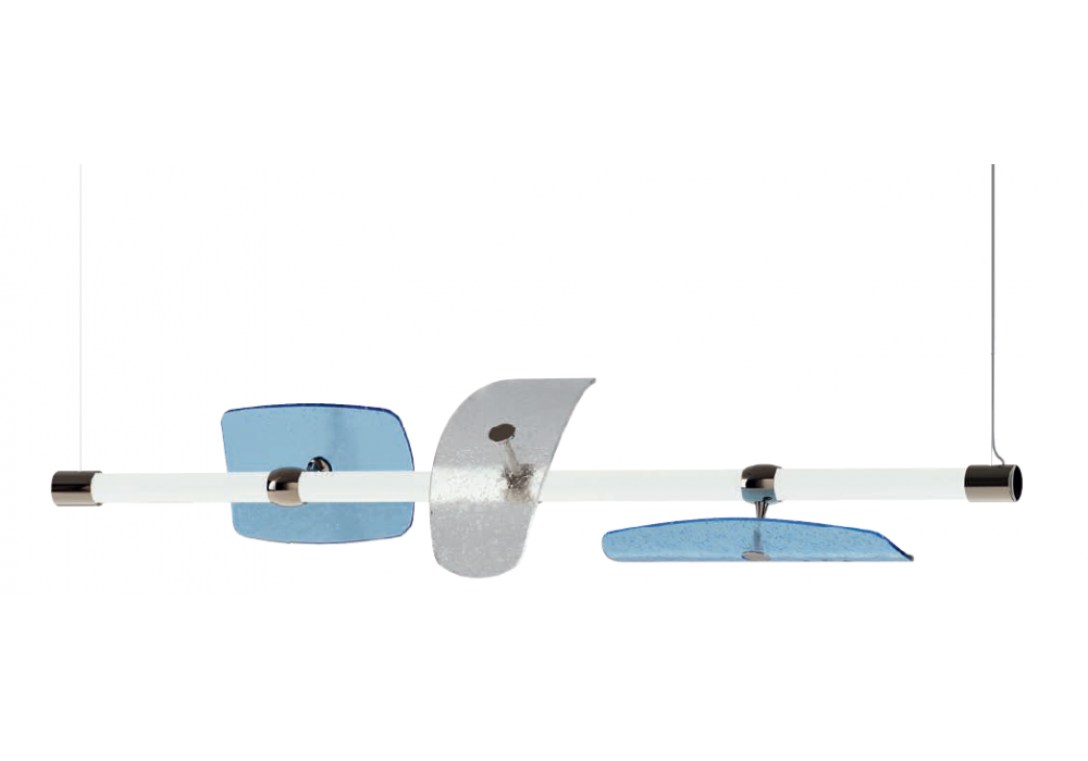 Axi designed by Patrick Jound Id for Italamp is a pendant lamp characterized by a tubular structure in white borosilicate glass which contains a LED light source, interspersed with metal elements from which arms extend onto which colored artistic glass panels are fixed, which they gravitate around the central element.