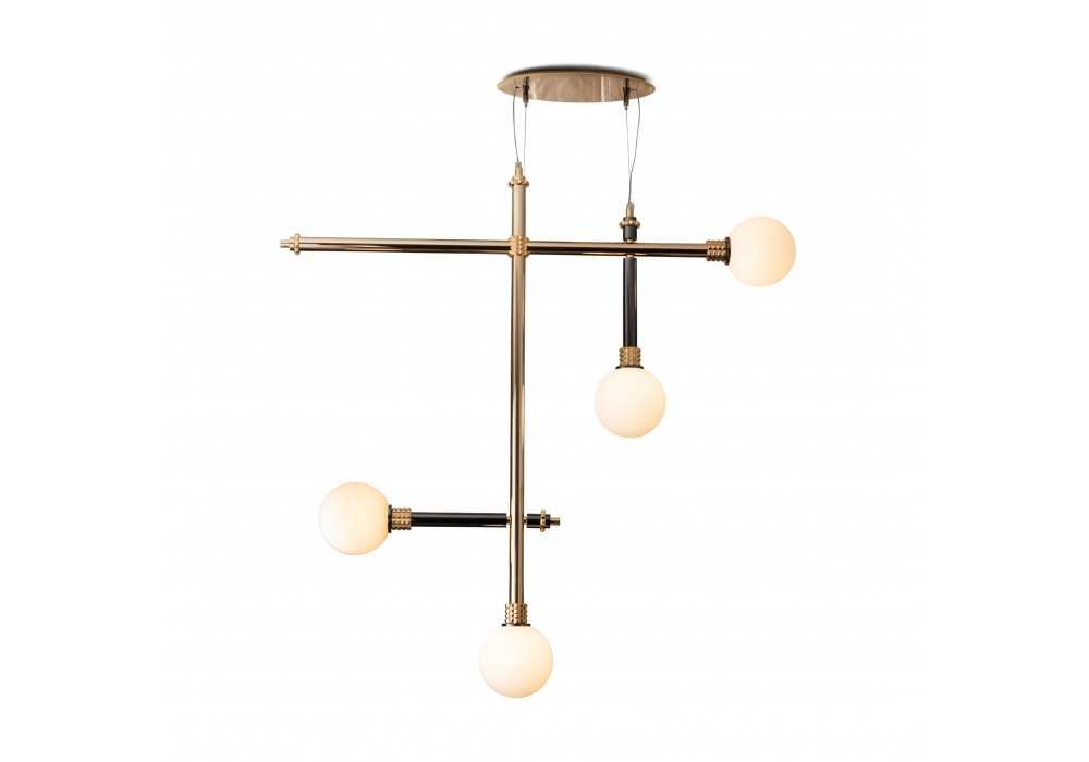 Alpha designed by Giuseppe ViganĂ² for Visionnaire is a chandelier with tubular brass supporting structure and solid brass bracelets. The diffusers are spherical in blown glass and adopt LED or halogen type light sources with G9 socket. Alpha is available in different finishes.