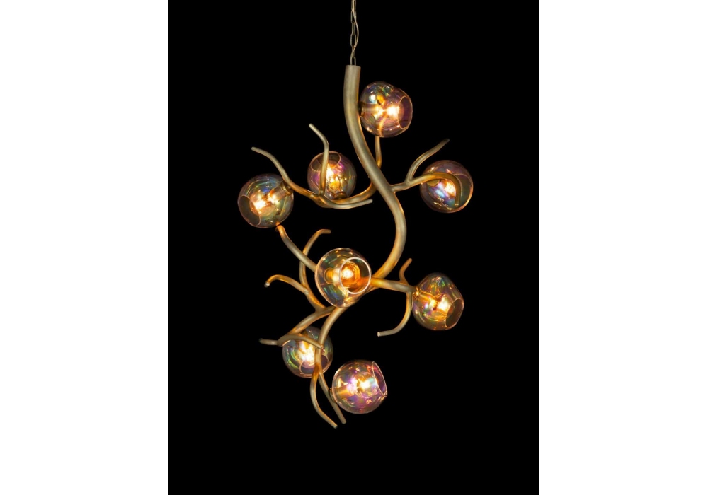 Ersa Vertical designed by William Brand for Brand Van Egmond is a pendant lamp made with metal structure and iridescent glass diffusers. Available in different finishes and dimensions. Upon request, the spheres can be made in translucent bronze or transparent glass.