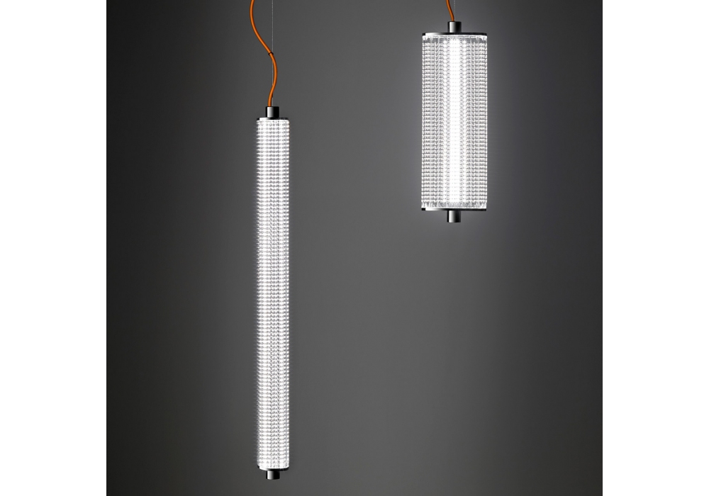 ex–Tr Vertical designed by Franco Raggi for Firmamento Milano is a pendant lamp with diffused light made of chromed steel and extruded cannulated glass. Orange fabric cable. Available in different finishes and dimensions.