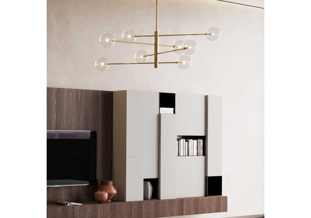 Equinoxe designed and produced by Ideal Lux is a suspension lamp with rosette and supporting structure in tubular metal. The tubular arms support spherical diffusers in transparent blown glass and shield LED light sources. Equinoxe is available in different models and finishes.