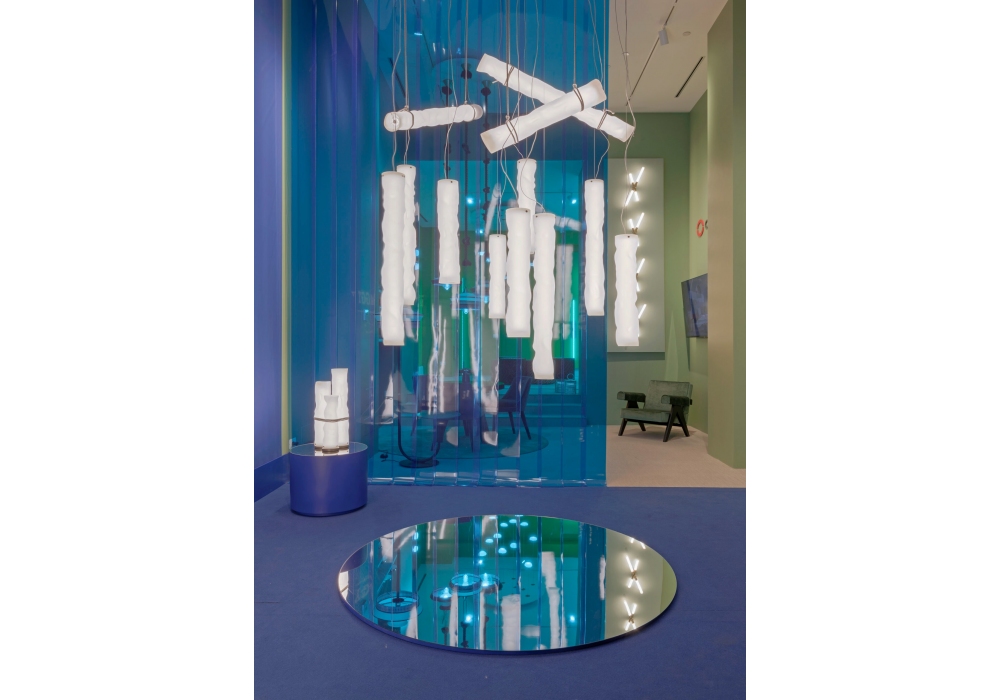Baggy Vertical designed by Paola Navone for Contardi is a pendant lamp with an irregular cylindrical body in bi-satin polycarbonate and a white and gray fabric suspension cord. The light source is a Strip LED type with dimmability system. Baggy Vertical is available in different models, suspension cord lengths and dimmable versions.