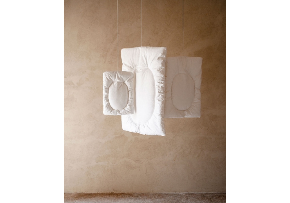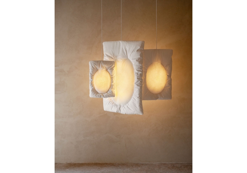 Lunar designed by Faye Toogood for Tacchini is a suspension lamp made of natural fibers and paper. Lunar lights feature quilted, creased covers, which cast a soft, subdued light thanks to the internal padding around the bulb. Available in different sizes.