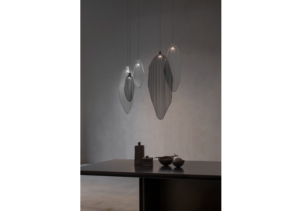 Harpe Multi designed by Christian Lava for Terzani is a pendant lamp structured entirely in metal rods with a shape similar to a leaf. The light sources are placed in the upper part of the structure and are LED type with dimmability system. Harpe Multi is available in different finishes, models and dimmability.