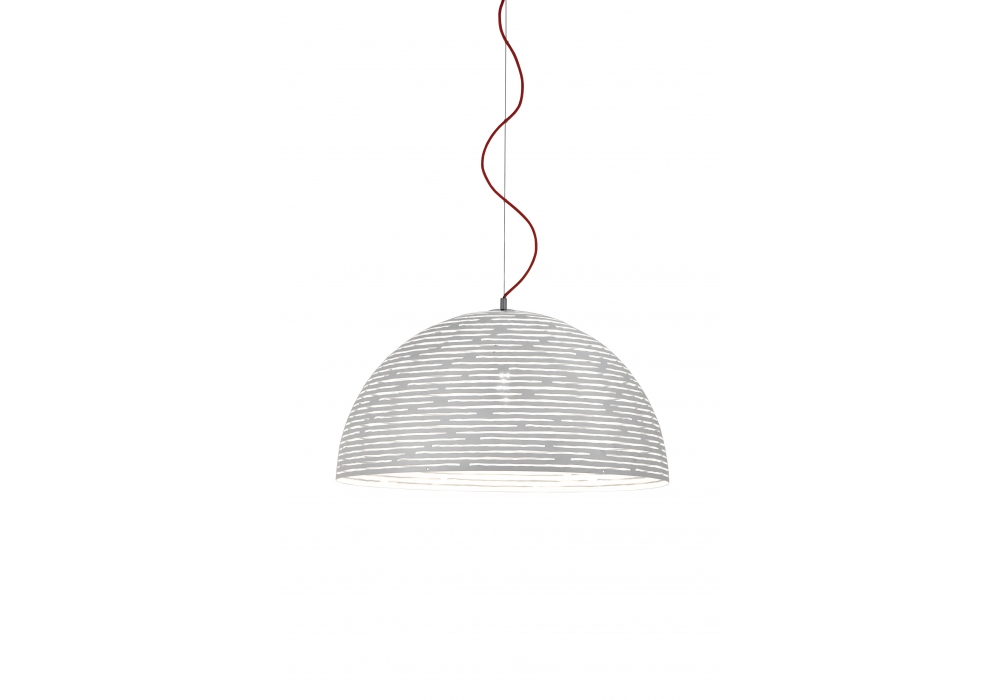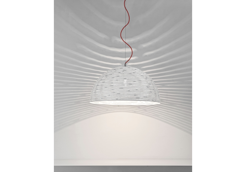 Magdalena Semi-Circular designed by Bruno Rainaldi for Terzani is a semicircular pendant lamp entirely made of perforated metal supported by steel cables. The light source adopted is with a dimmable LED type E27 socket. Magdalena Semi-Circular is available in different models and finishes.