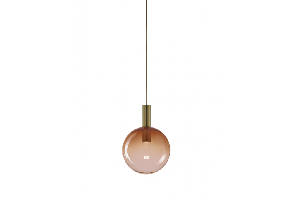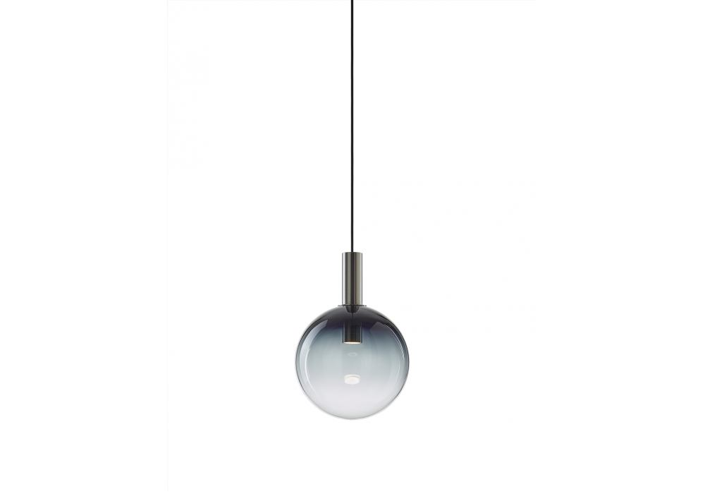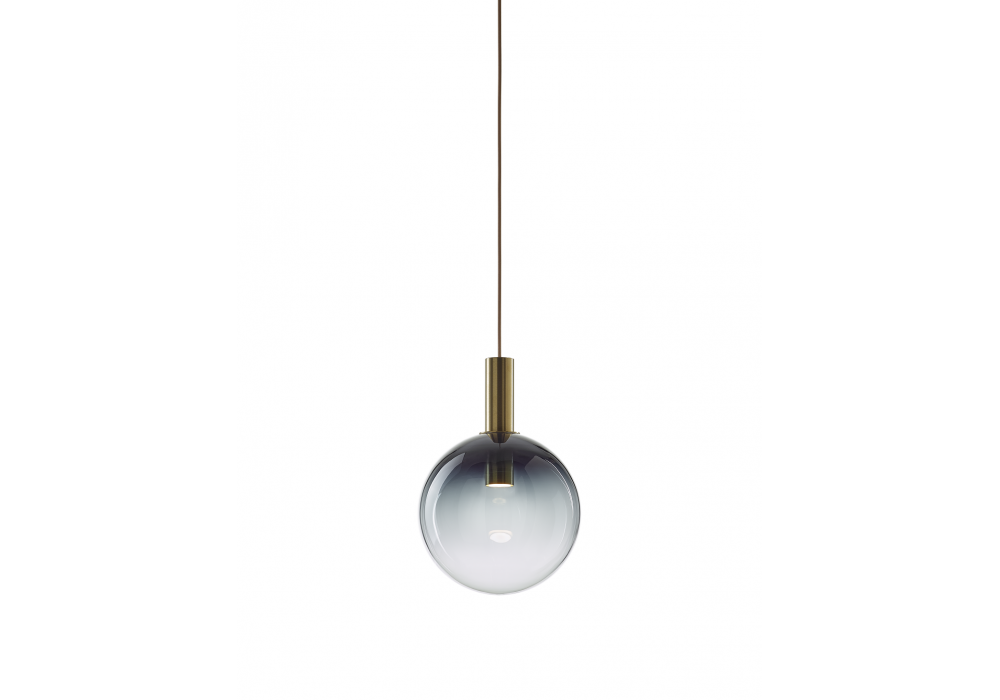 Divina designed by Dechem Studio for Bomma is a pendant lamp with a mouth-blown crystal diffuser and brushed metal rosette and detail. Available in different finishes.