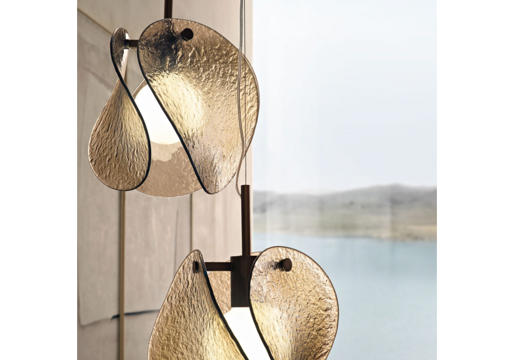 Tau designed by Ryosuke Fukusada is a pendant lamp with a metal structure in burnished brass finish. Decorative diffuser composed of three elements in smoked glass or high-fired fused bronze.