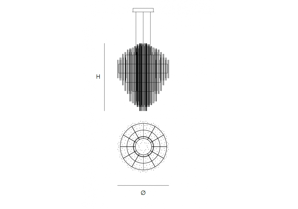 Skyfall designed by Jan Pauwels for Quasar is a pendant lamp composed of metal rods and tiny luminous glass tubes that look like raindrops. Available in different finishes.