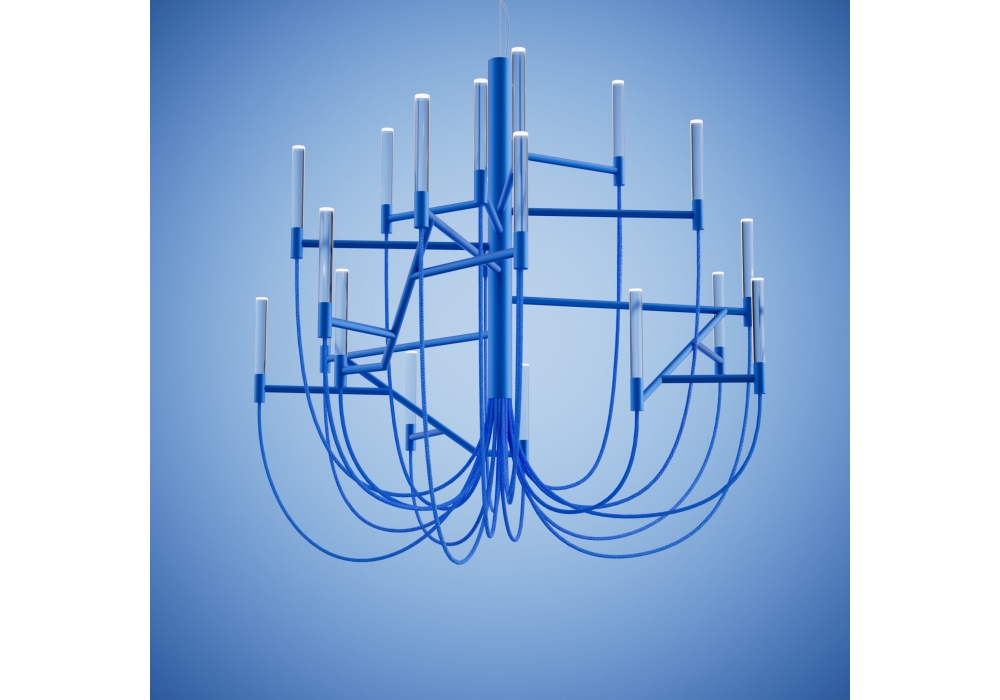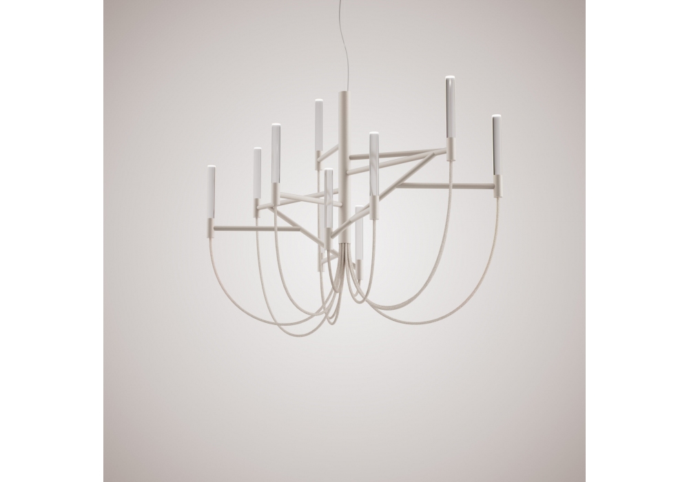 Allumette designed by Franesca Lanzavecchia for Foscarini is a suspension lamp inspired by classic chandeliers, featuring a metal structure that blends with the softness of the textile cables, giving it an almost sculptural and asymmetrical shape.