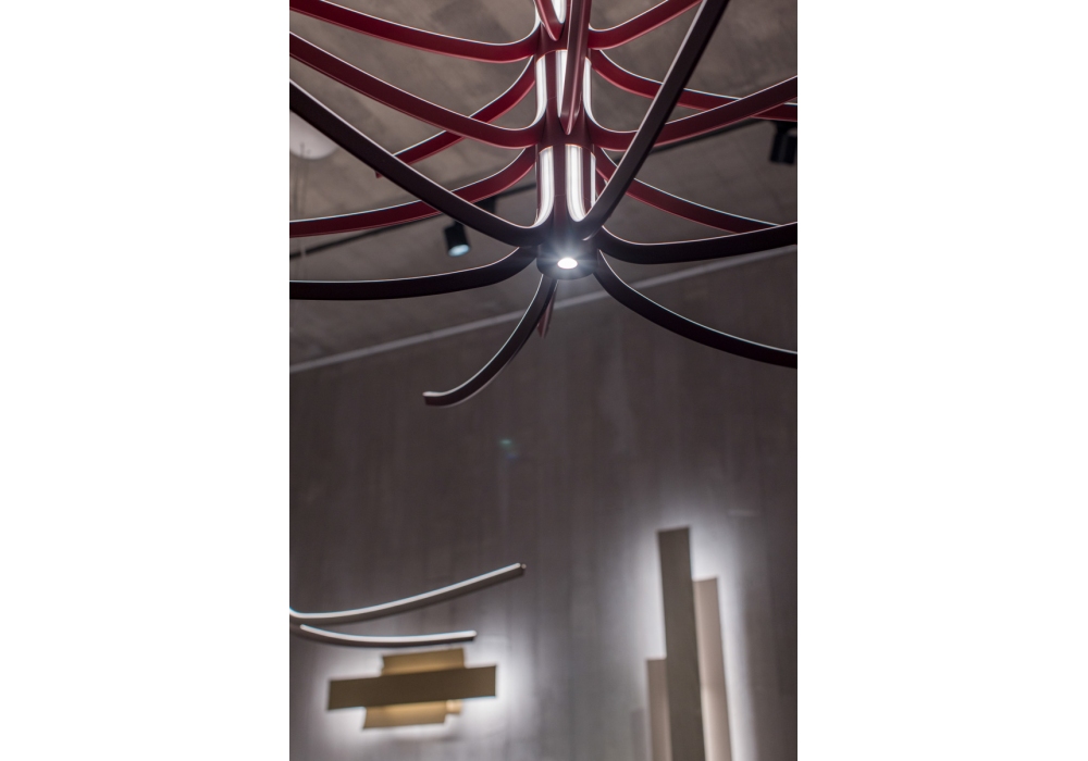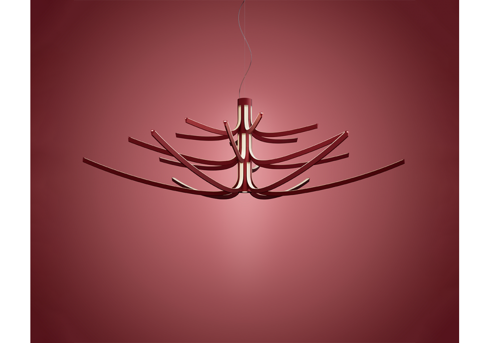 Allumette designed by Alberto and Francesco Meda for Foscarini is a suspension lamp inspired by classic chandeliers, but reformulated to its essential elements, it is composed of curved aluminum arms with integrated LEDs. It can be produced in different aesthetic configurations at one level or more levels.