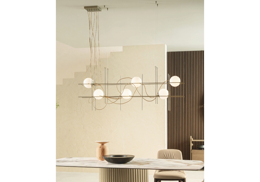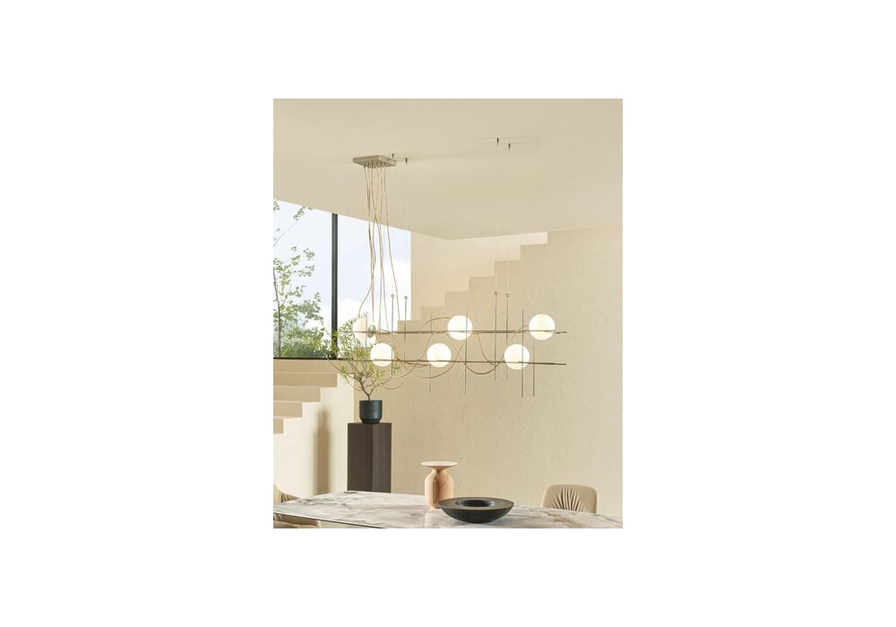 Iron - S designed by Riflessi is a pendant lamp made with a painted metal structure and satin white glass diffusers.