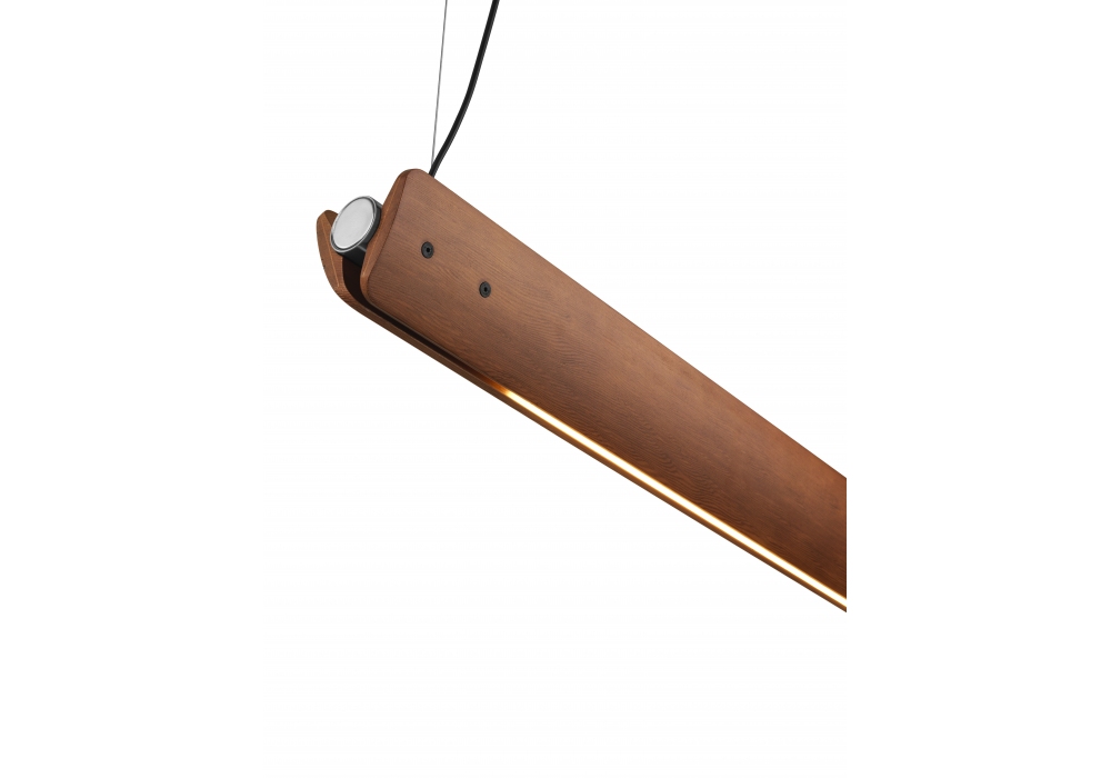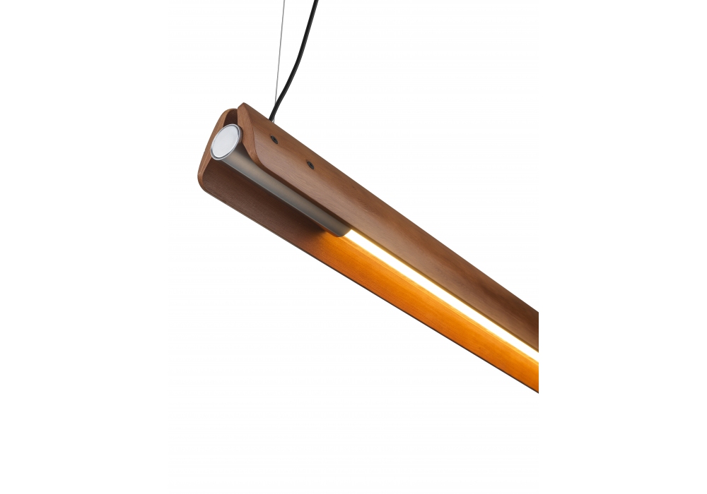 Seki-Han designed by Tobia Scarpa for Flos is a pendant lamp made with a heat-treated and CNC-worked ash wood structure, terminals and rosette in polished and zapon-coated aluminum. TRIAC dimmable.
