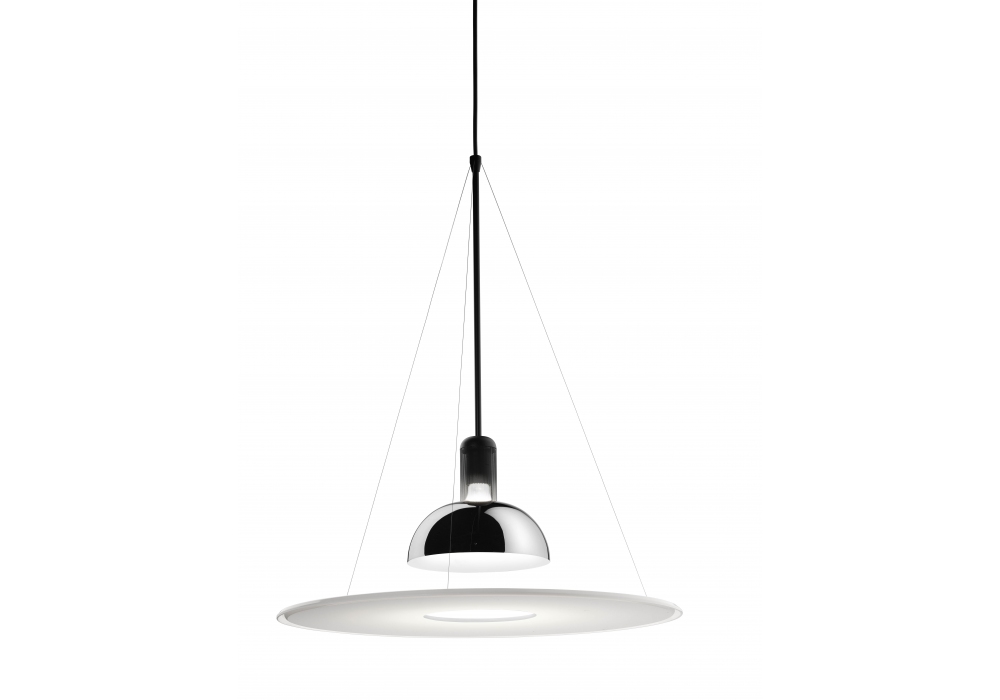 Frisbi designed by Achille Castiglioni for Flos is a pendant lamp with direct, diffused and reflected light. Diffuser plate in opaline polymethyl methacrylate (PMMA) injection-molded, attached to the body of the device by three thin wires of harmonic steel. Reflector in stamped sheet metal, polished, nickel-plated, zapon, painted glossy white on the inside. Wall attachment and rosette in black injection-molded ABS. Remotely adjustable (dimmer not included). Bulb not included.