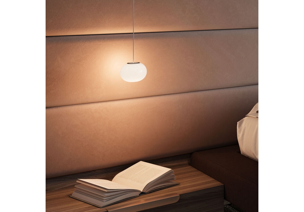 Mini Glo-Ball S designed by Jasper Morrison for Flos is a pendant lamp with diffused light. Diffuser in mouth-blown, cased opal glass with external acid-etched finish. Lamp holder in injection-molded PPS, liquid-painted in white. Remotely adjustable (dimmer not included). Bulb not included.