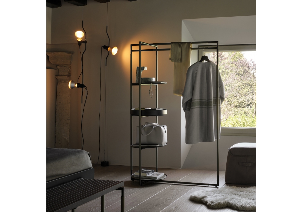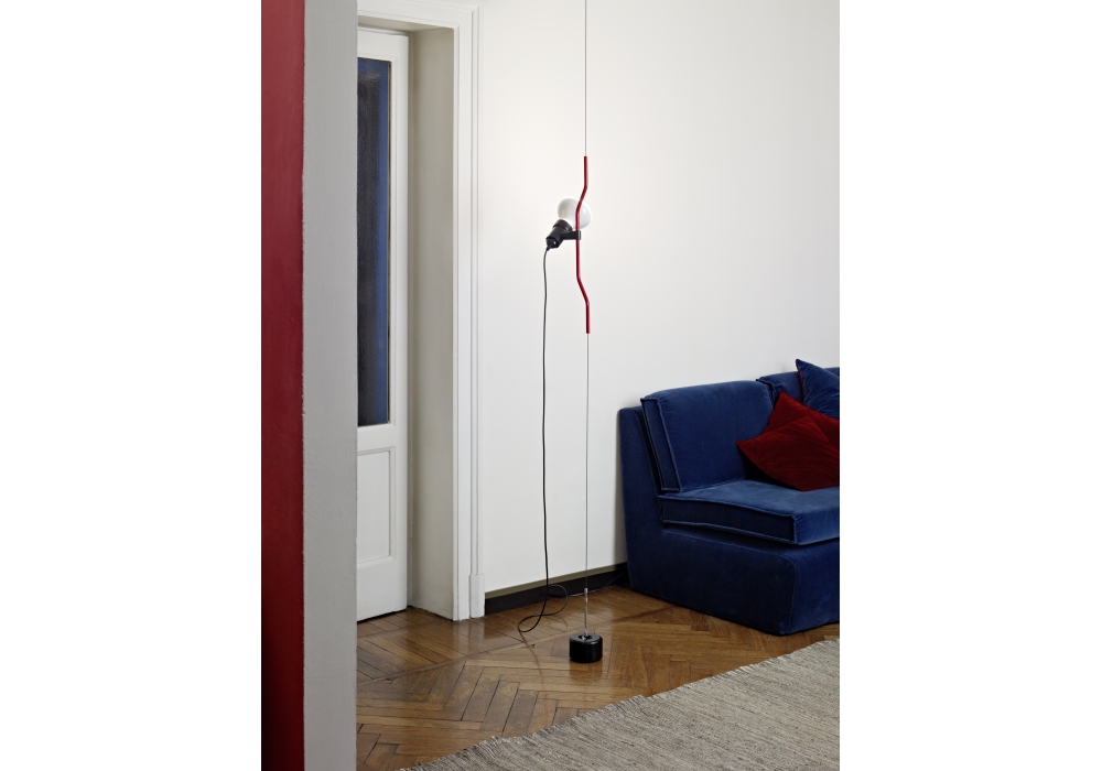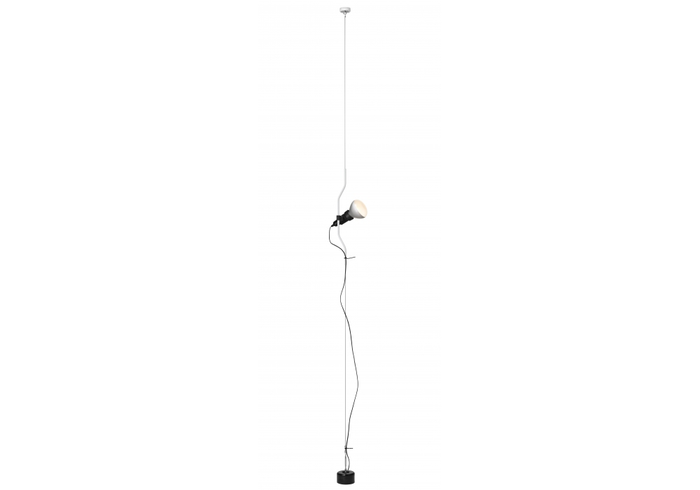 Parentesi designed by Achille Castiglioni & Pio Manzù for Flos is a direct light lamp. The vertical movement of the lighting body is obtained by sliding a shaped steel tube, liquid painted or nickel-plated, on a steel cable stretched between the ceiling and the floor. The head of the device is made of black injection-molded elastomer, inside which the device switch is housed. Available with ON/OFF switch or with integrated dimmer. Bulb not included.