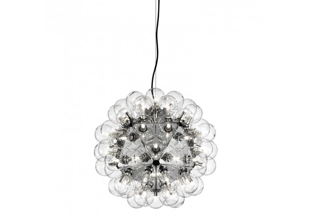 Taraxacum 88 S2 designed by Achille & Pier Giacomo Castiglioni for Flos is a pendant light fixture with direct and reflected light. Structure composed of 20 triangles in polished printed aluminum. 60 clear Globolux bulbs housed around the structure. Ceiling attachment and steel rose. Remotely adjustable (dimmer not included). Bulbs included.